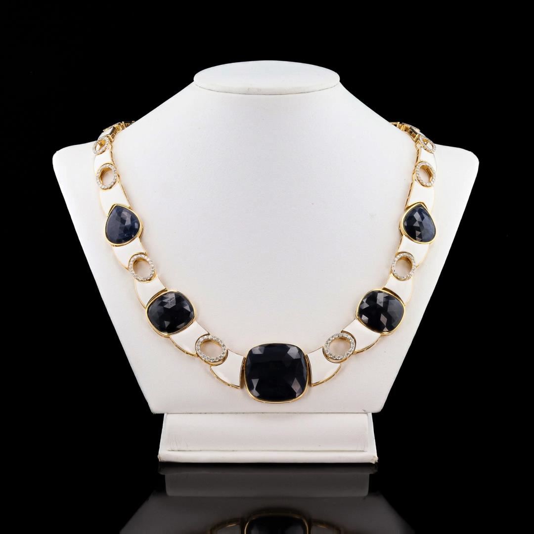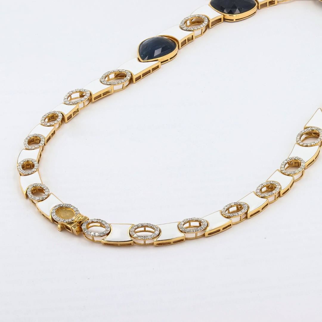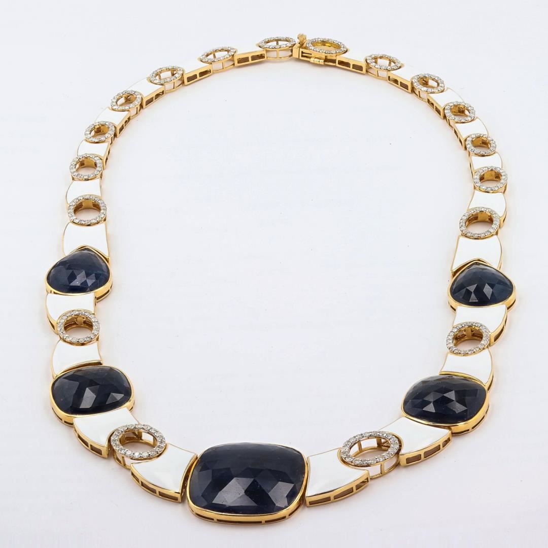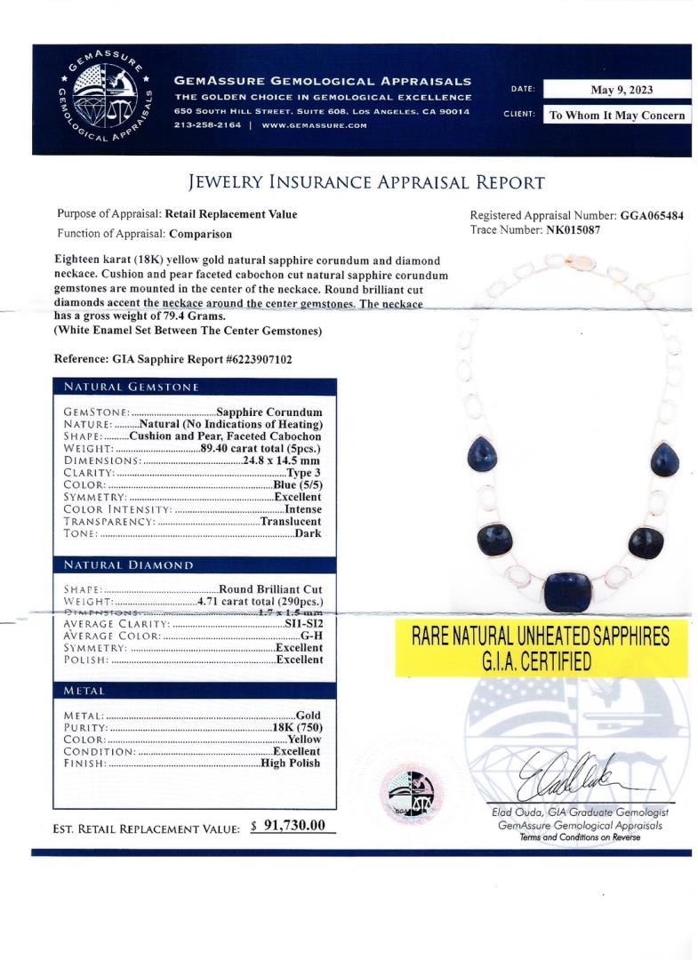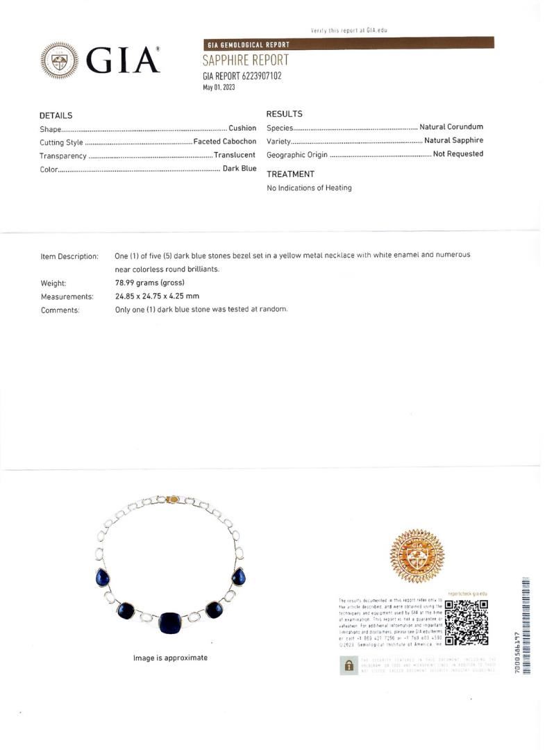Eighteen karat (18K) yellow gold natural sapphire corundum and diamond necklace. Cushion and pear faceted cabochon cut natural sapphire corundum gemstones are mounted in the center of the necklace. Round brilliant cut diamonds accent the necklace around the center gemstones. The necklace has a gross weight of 79.4 Grams. (White Enamel Set Between The Center Gemstones) Reference: GIA Sapphire Report 6223907102 #NATURAL GEMSTONE# GEMSTONE: Sapphire Corundum; NATURE: Natural (No Indications of Heating); SHAPE: Cushion and Pear, Faceted Cabochon; WEIGHT: 89.40 carat total (5pcs.); DIMENSIONS: 24.8 x 14.5mm; CLARITY: Type 3; COLOR: Blue (5/5); SYMMETRY: Excellent; TRANSPARENCY: Translucent; TONE: Dark #NATURAL DIAMOND# SHAPE: Round Brilliant Cut; WEIGHT: 4.71 carat total (290pcs.); DIMENSIONS: 1.7 x 1.5mm; AVERAGE CLARITY: SI1-SI2; AVERAGE COLOR: G-H; SYMMETRY: Excellent; POLISH: Excellent #METAL# METAL: Gold; PURITY: 18K (750); COLOR: Yellow; CONDITION: Excellent; FINISH: High Polish #Size: 17
