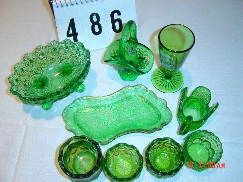 (9) PIECES OF GREEN GLASS - DAISY & BUTTON dish, (3) salts, (1) master salt, (1) basket dish, (1) sandwich dish, (1) cordial, (1) small dish