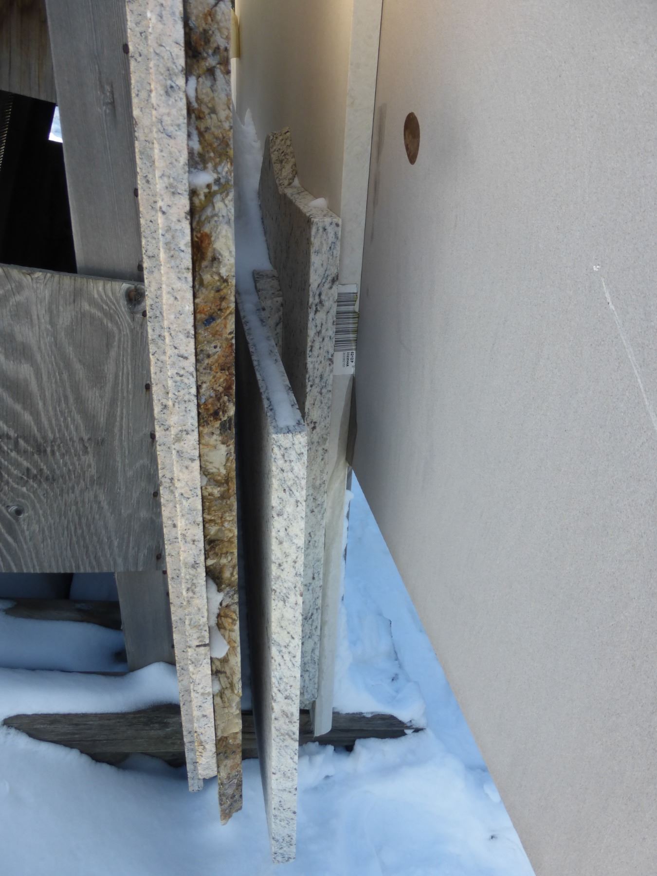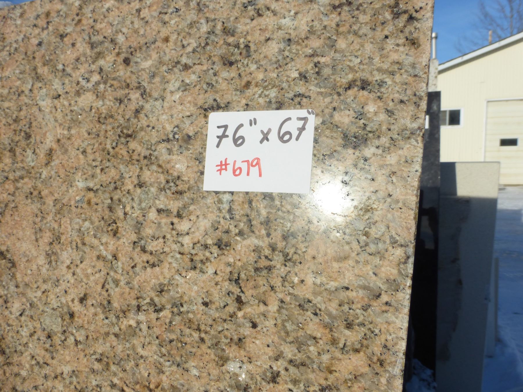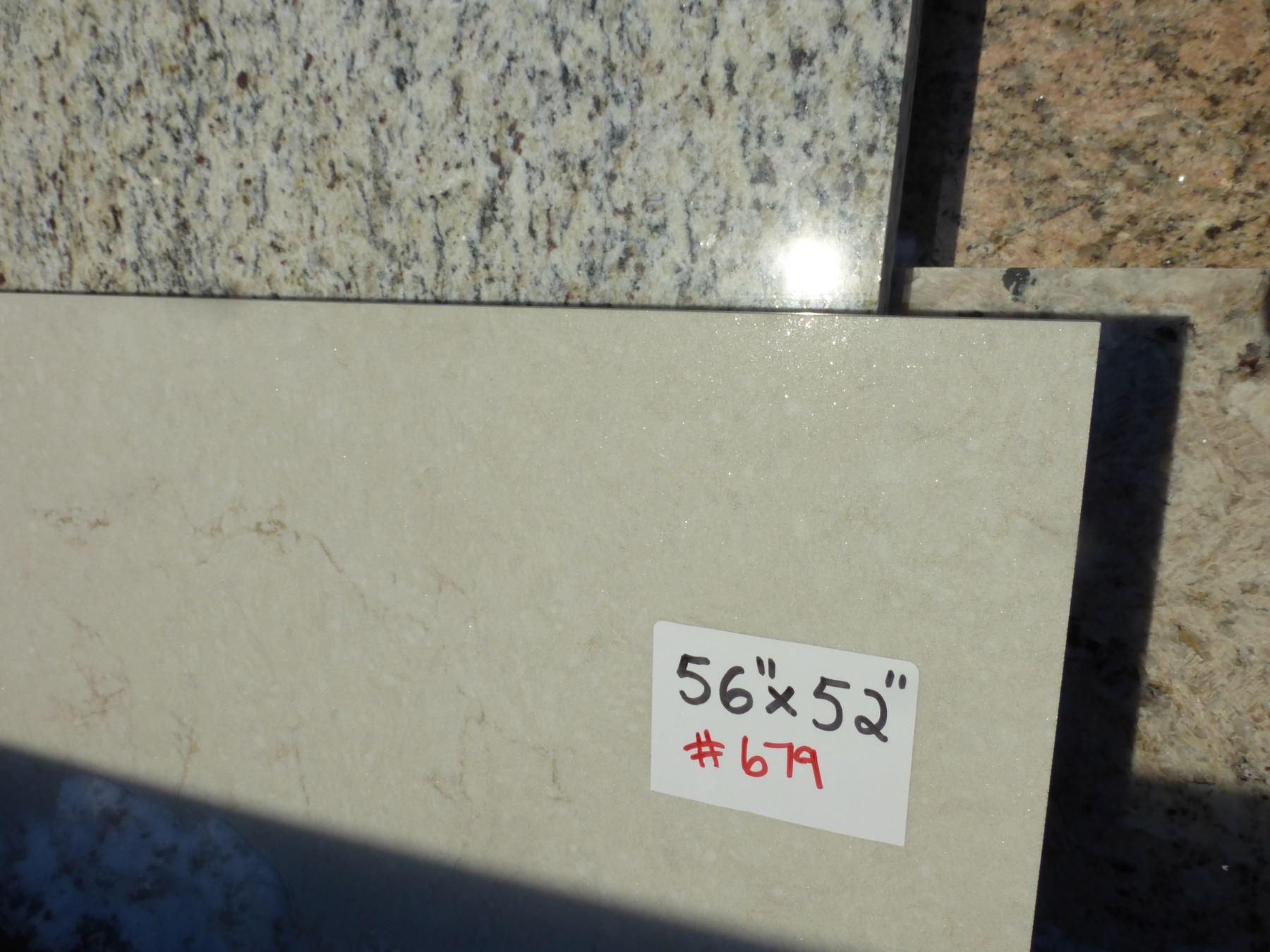 9- Slabs, Various sizes x 3/4" think, Giallo veneziano Granite, 1 1/4" thick, Giallo ornamental, Delicates white Granite and 1 1/4" thick Lagos blue Quartz and other various colors of Quartz