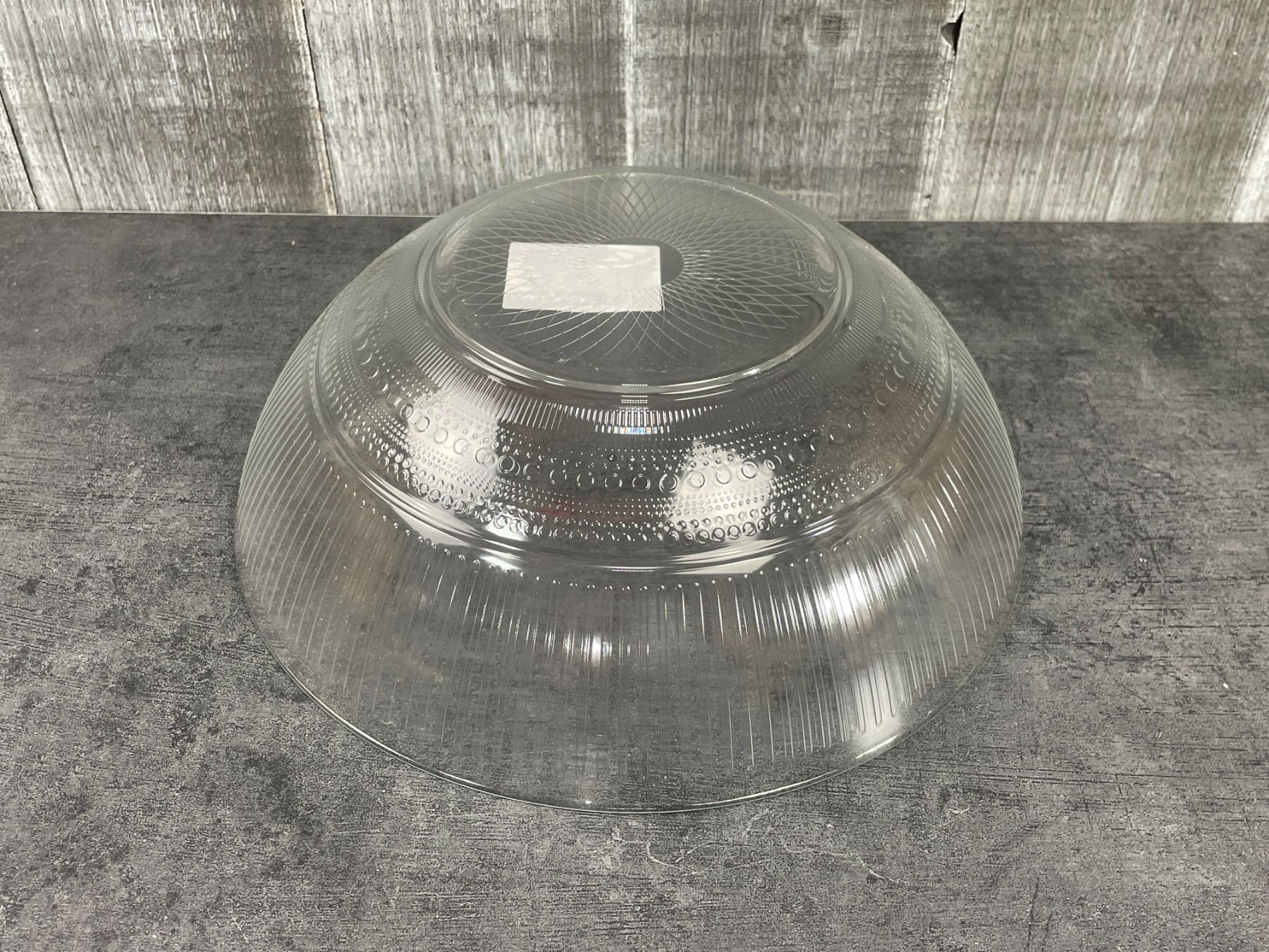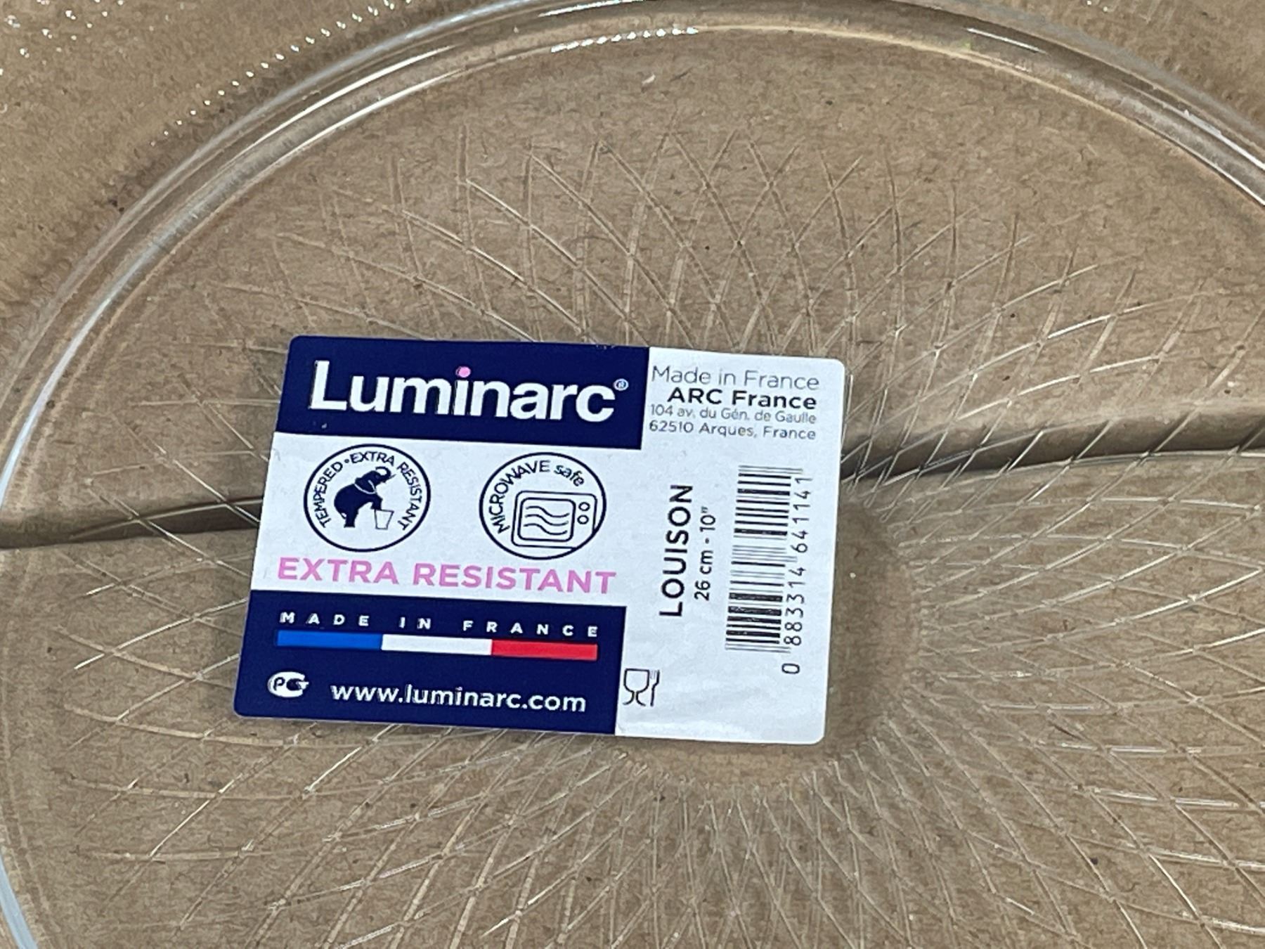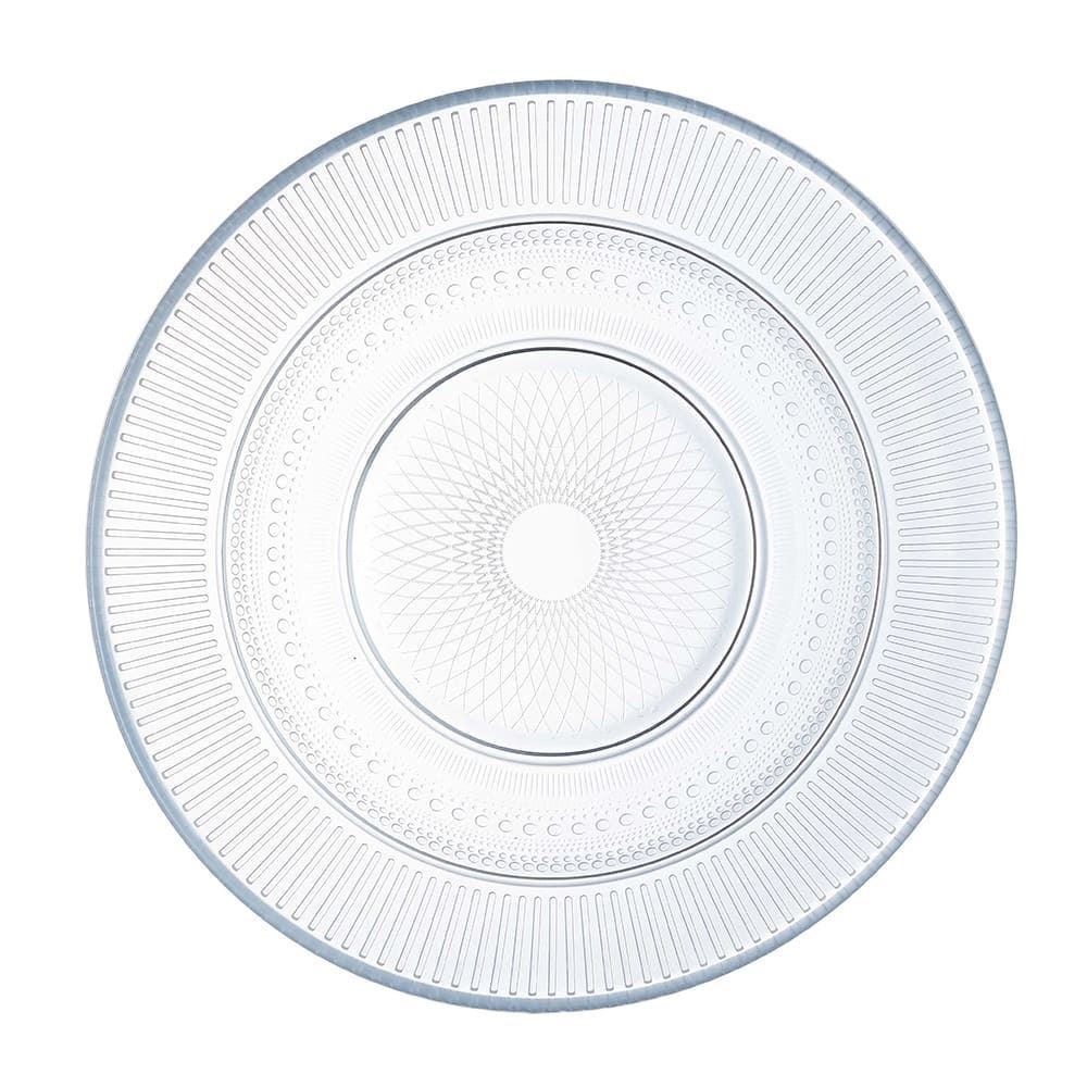 [New In Boxes,] Made In France, Fully tempered clear glass, patterned with lines and beaded textures. 10.25" Diameter