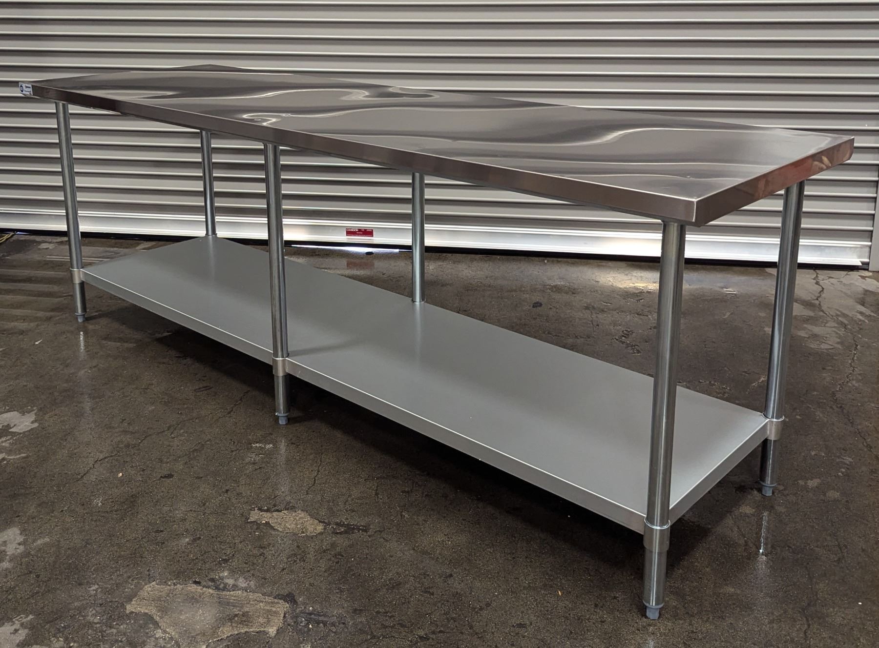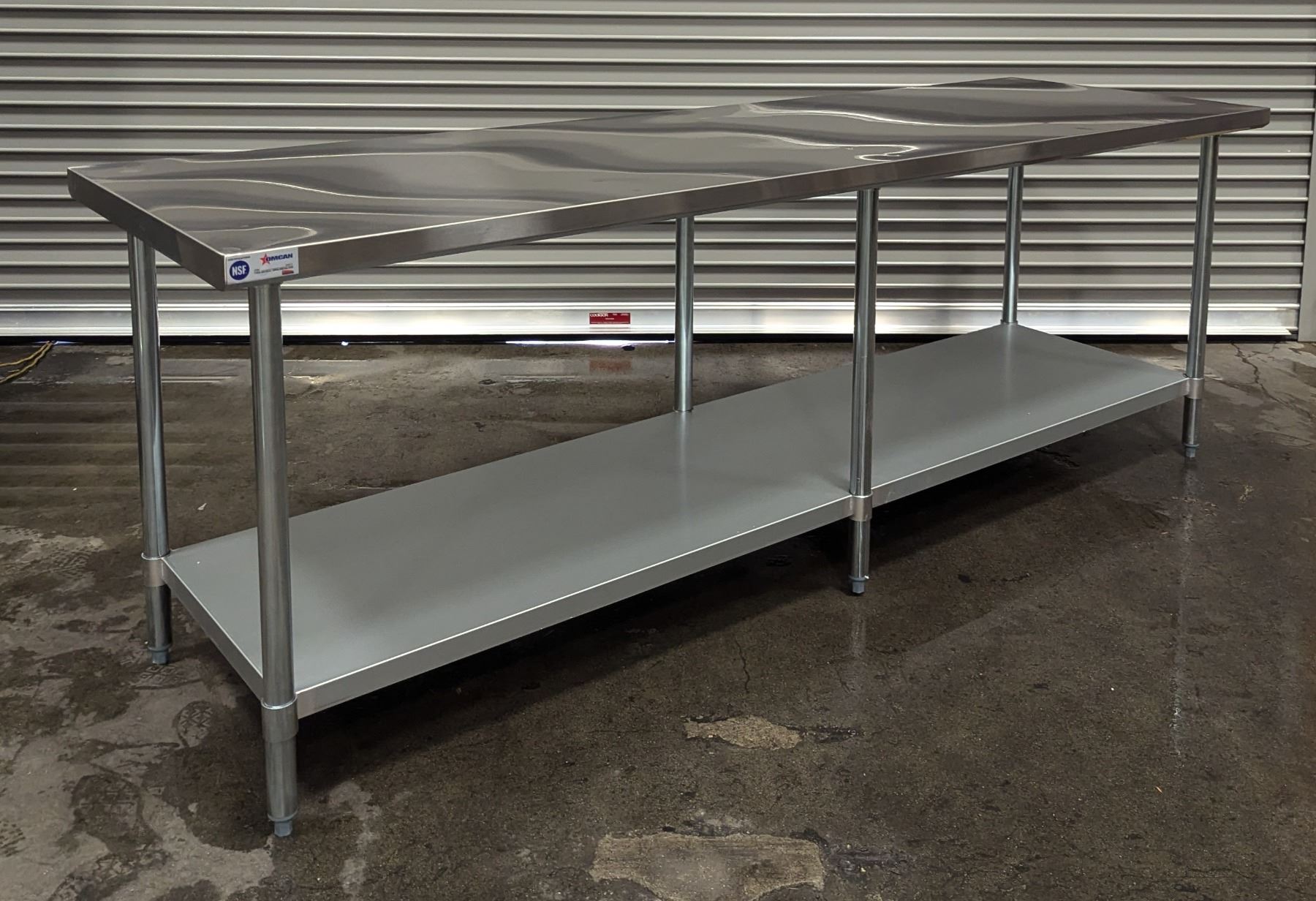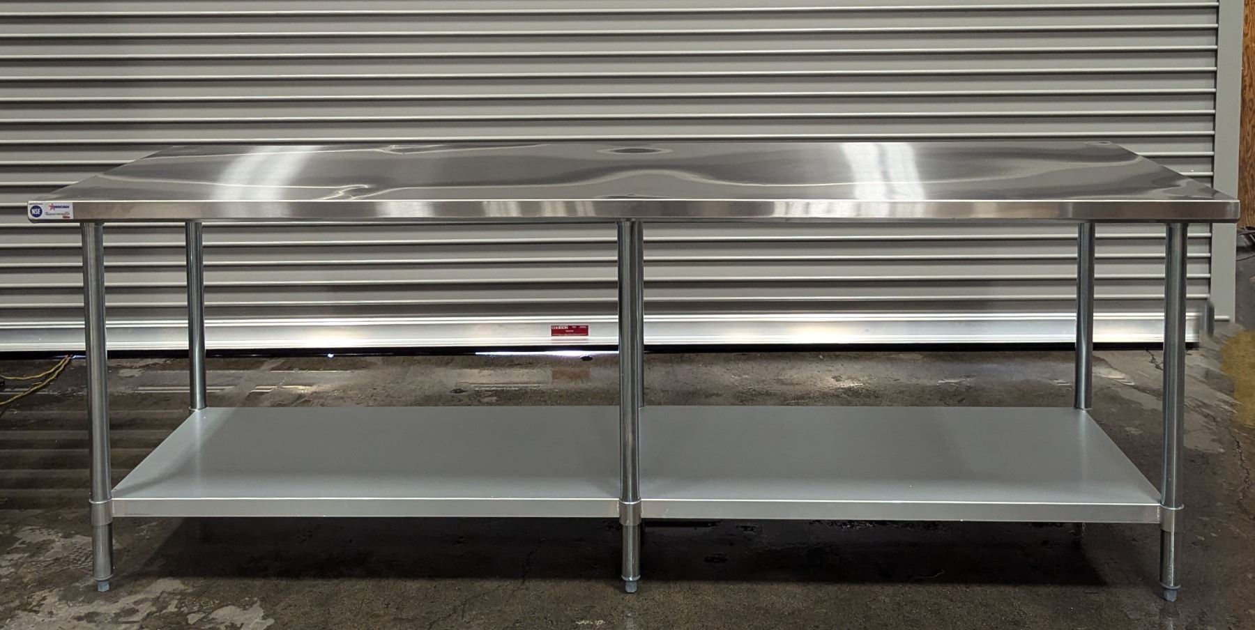 [New in Box,] 18 Gauge 430 Stainless Steel, Top Load Capacity: 1157lbs, Undershelf Capacity: 485lbs, Fully Adjustable Undershelf, Plastic Bullet Feet (34" Height Adjustable from 33.5" to 34.5",) Galvanized Legs