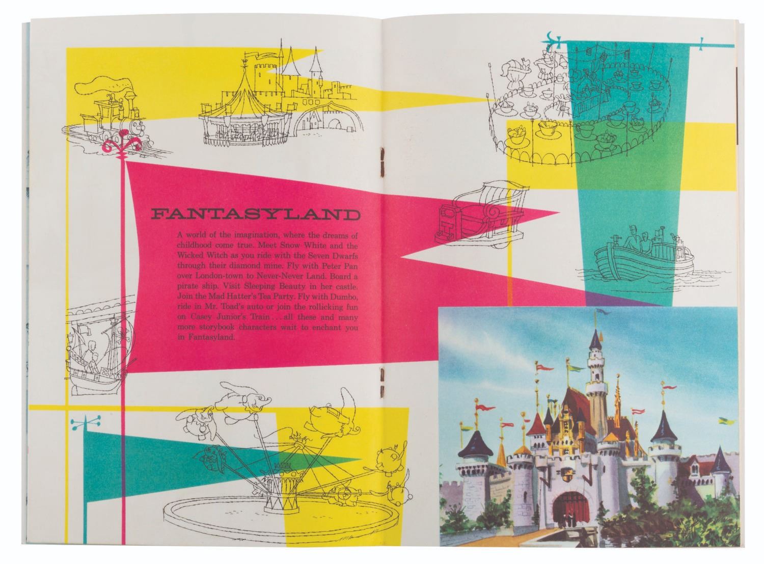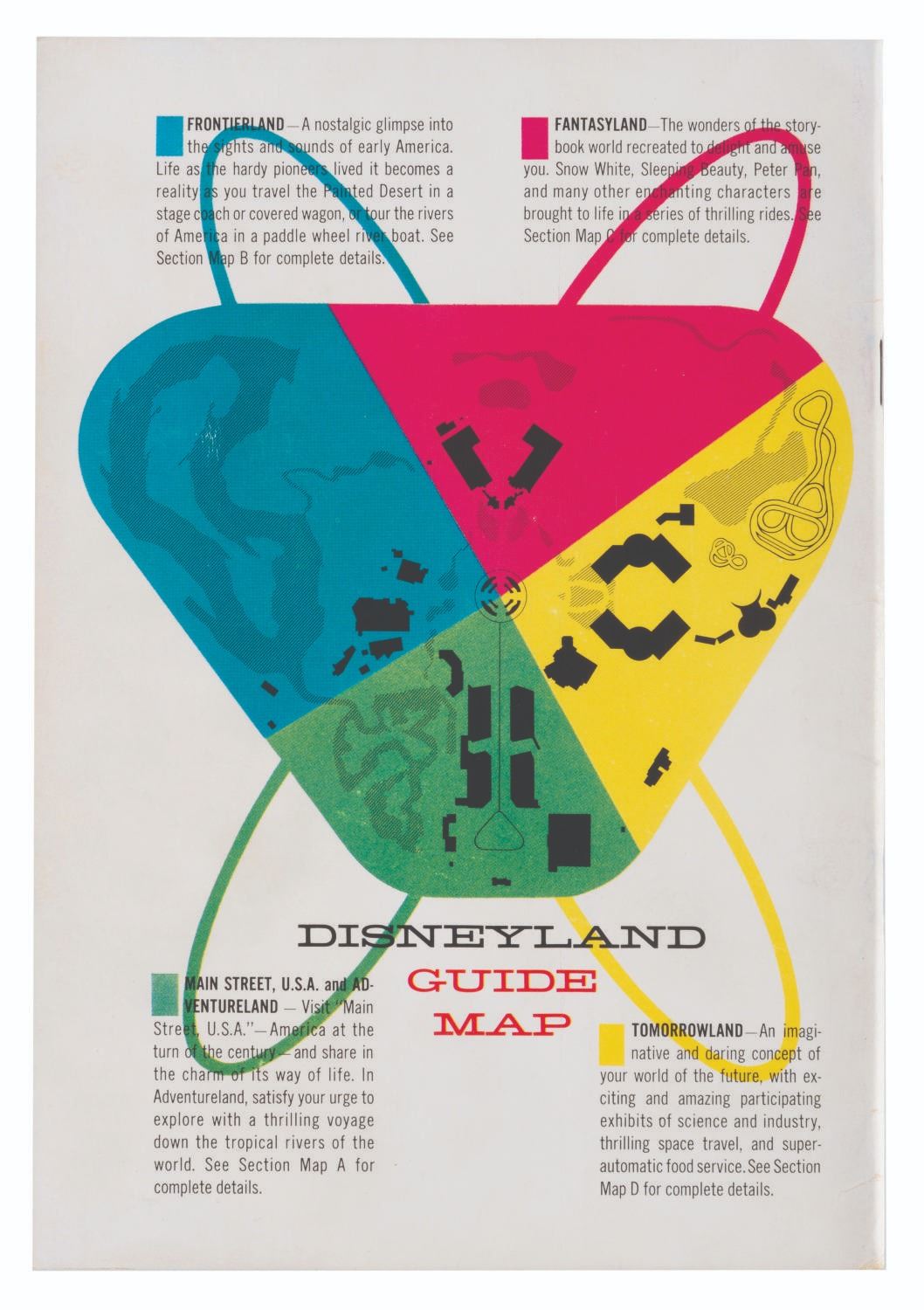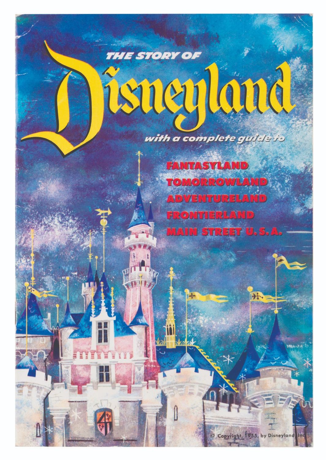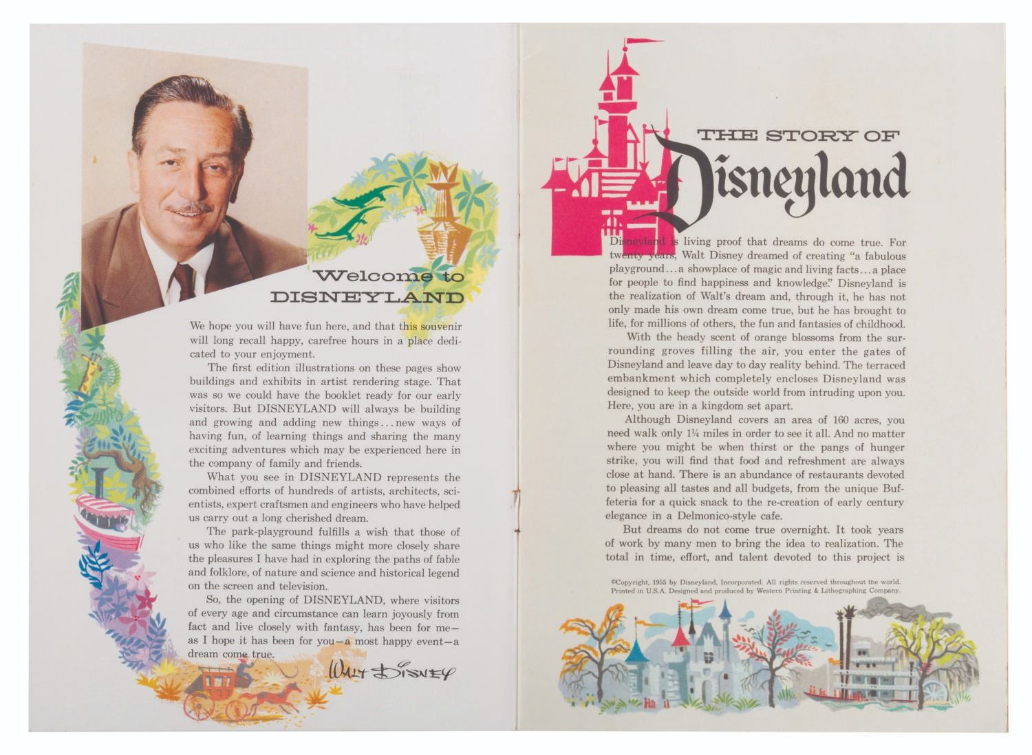 (Disneyland, 1955) An opening year, The Story of Disneyland souvenir guidebook with a complete guide to the Park's original lands. The guidebook features a"Welcome" by Walt, section maps, and a special page advertising"Hotel Accommodations" through the soon-to-open Disneyland Hotel. Measuring 6" x 8.75", the guide is in good condition with light creasing along the spine and corners. The guidebook includes the original Disneyland mailing envelope, in fair condition with discoloration, creasing, tears, soiling, and tape repairs.
