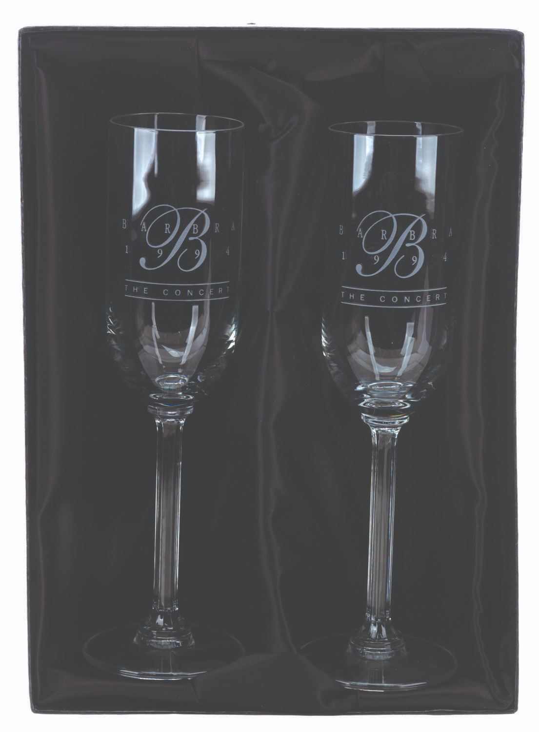 (Streisand, 1993-94) A pair of champagne flutes from Barbra Streisand's New Year's Eve 1993/New Year's Day 1994 two-night residency at the newly-built MGM Grand Las Vegas, dubbed"The Concert." The spectacular event celebrated the first time Barbra had performed live in almost two decades. Measuring 9" tall and 2.75" in diameter in their 10.5" x 7.75" x 4.75" tall original box, the glasses are in very good condition with light wear, while the branded box exhibits scratches, scuffs, and wear.