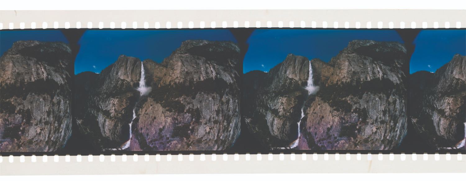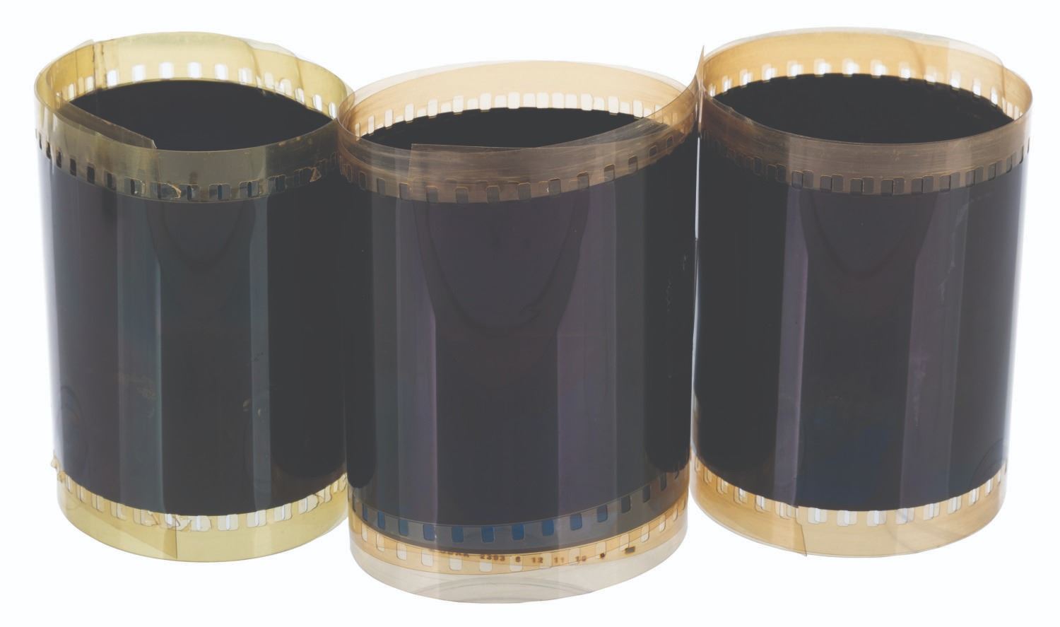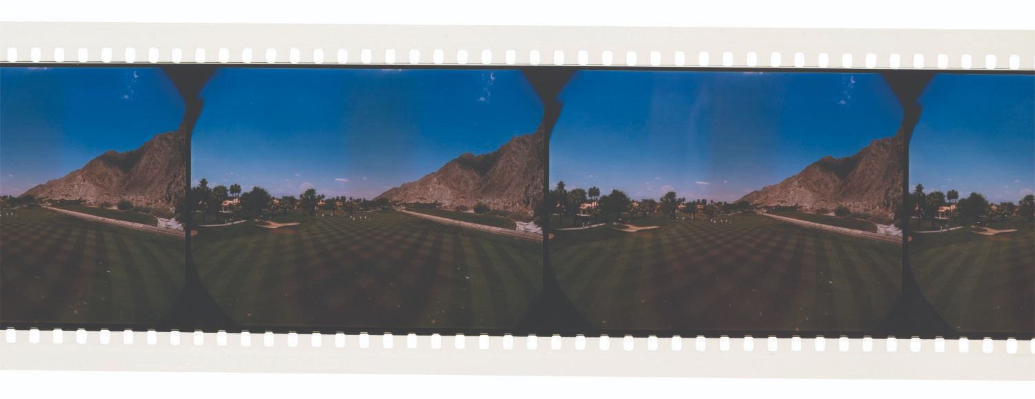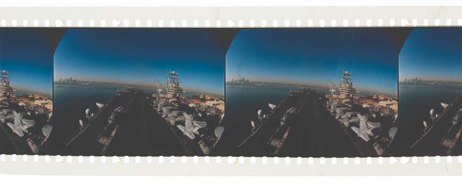 (Disney's California Adventure, 2000s) A collection of three film strips used in the OMNIMAX presentation of Soarin' Over California at Disney's California Adventure. The 70mm IMAX film strips include shots of Yosemite, golfing in Palm Springs, and the USS John C. Stennis aircraft carrier anchored in San Diego. Measuring 16" x 2.25" to 17.25" x 2.25", the film strips are in good condition with creasing, scuffing, and a few broken perforations from Park use.