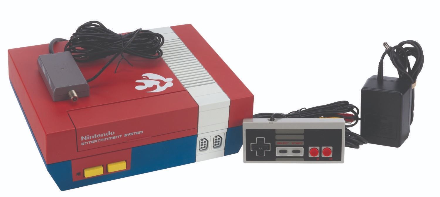 (F5'd Memories, 2010s) A custom-painted Nintendo Entertainment System by Sater Fivel aka F5'd Memories. The console comes in a Mario Bros themed design featuring Mario's distinctive red, white, blue and yellow color scheme along with his silhouette on the lid. The console includes the painted NES Control Deck, custom painted, F5'd Memories drawstring bags, AC and RF adapters, A/V composite cables, and one standard NES controller. In untested condition, the console may require servicing. Measuring 3.5" x 8" x 10," the console is in fine condition.