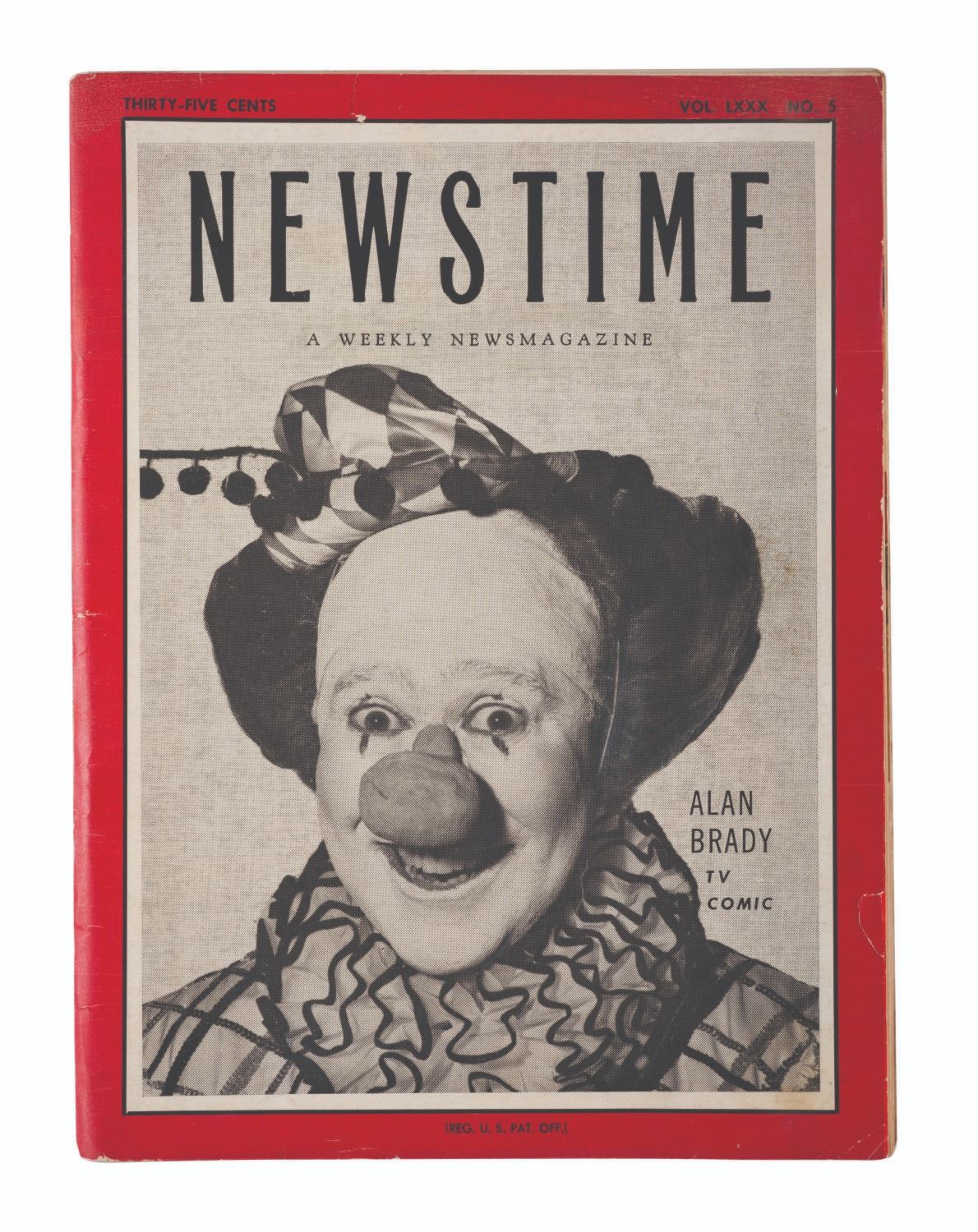 (Cavada/CBS, 1964) A very rare Newstime magazine prop from the classic television series "The Dick Van Dyke Show." This prop was created for the third season episode"My Husband is the Best One" and depicts fictional TV comic Alan Brady, played by the show's creator, Carl Reiner. Newstime magazines are featured throughout the episode and held by the show's stars, including Dick Van Dyke and Mary Tyler Moore. Measuring 8.5" x 11.25", the screen-used prop displays in very good condition with typical wear from production use, including creases, scratches, and edge tears up to 0.5" long.