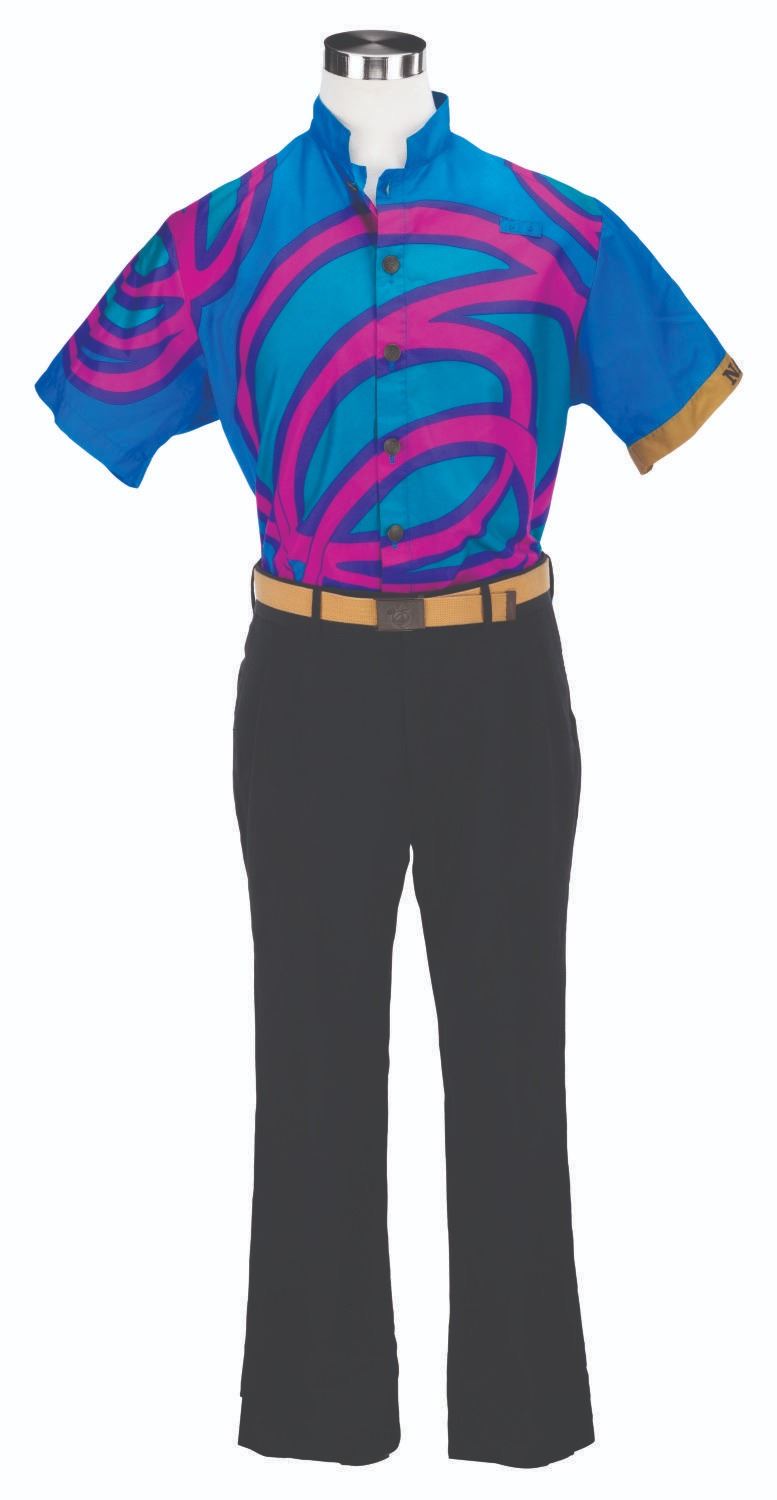 (Walt Disney World, 1998-2017) A vibrant costume worn by Cast Members working at DisneyQuest, the interactive entertainment experience chain that started in 1998 and closed in 2017. Included are a button-up shirt featuring "Navigator" on the left sleeve, black slacks with internal Downtown Disney and Disney Cruise Line labels, and a beige belt with the DisneyQuest logo on its buckle. The shirt is labeled a size L, the pants 38"x34", and the belt one-size-fits-most. The costume is in good condition with discoloration along the shirt collar, stains, wear, light pilling on the belt, and heavy oxidation on the belt buckle.