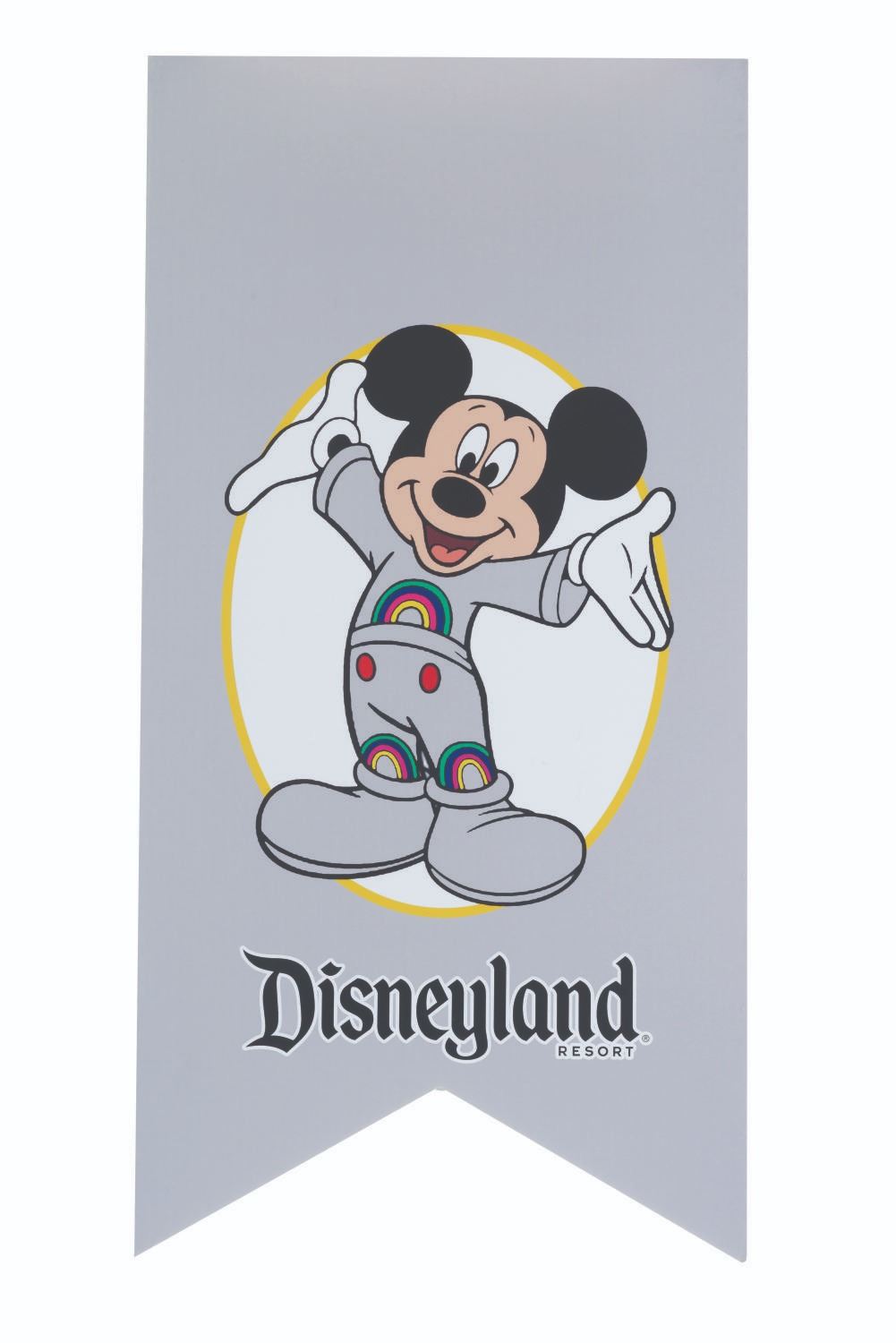 (Disneyland Resort, 2000s) A lamppost sign of Mickey Mouse in his 1980s Tomorrowland costume originally displayed at the Disneyland Resort. Measuring 24" x 48", the PVC board sign is in good condition with scratches, light stains, and edge wear.