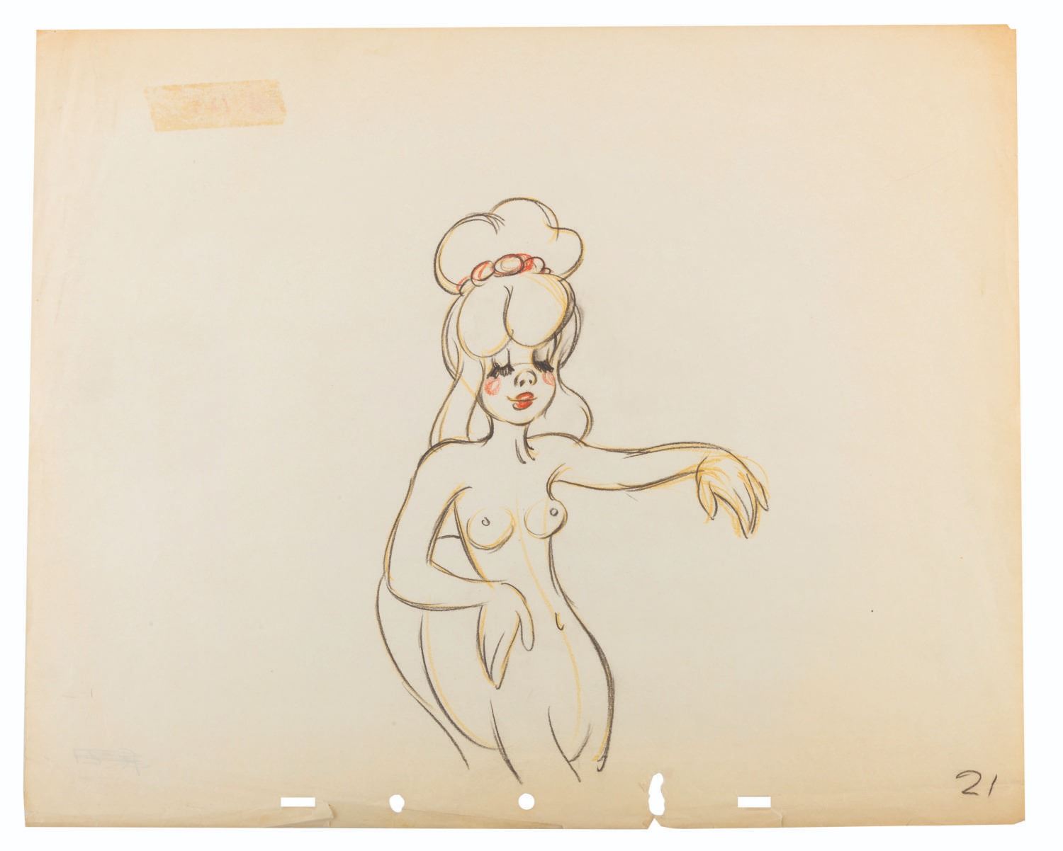 (Disney, 1940) An original production drawing of a centaurette from the Pastoral Symphony segment of"Fantasia," by Disney Legend Fred Moore. Moore imbued his charm and wit into every project he supervised at the Disney Studios, and the Pastoral Symphony is no exception. His drawings are highly sought after for his unique draftsmanship of the human form, and prominent characters such as this are rarely available. The centaurette has an image size of 6" x 9" on 12.5" x 15.5" animation paper. The graphite and colored pencil drawing displays in very good condition with creases, discoloration from age, edge wear and tears, including a torn peg hole, and tape and writing on the reverse, which are visible from the front but do not affect the image.
