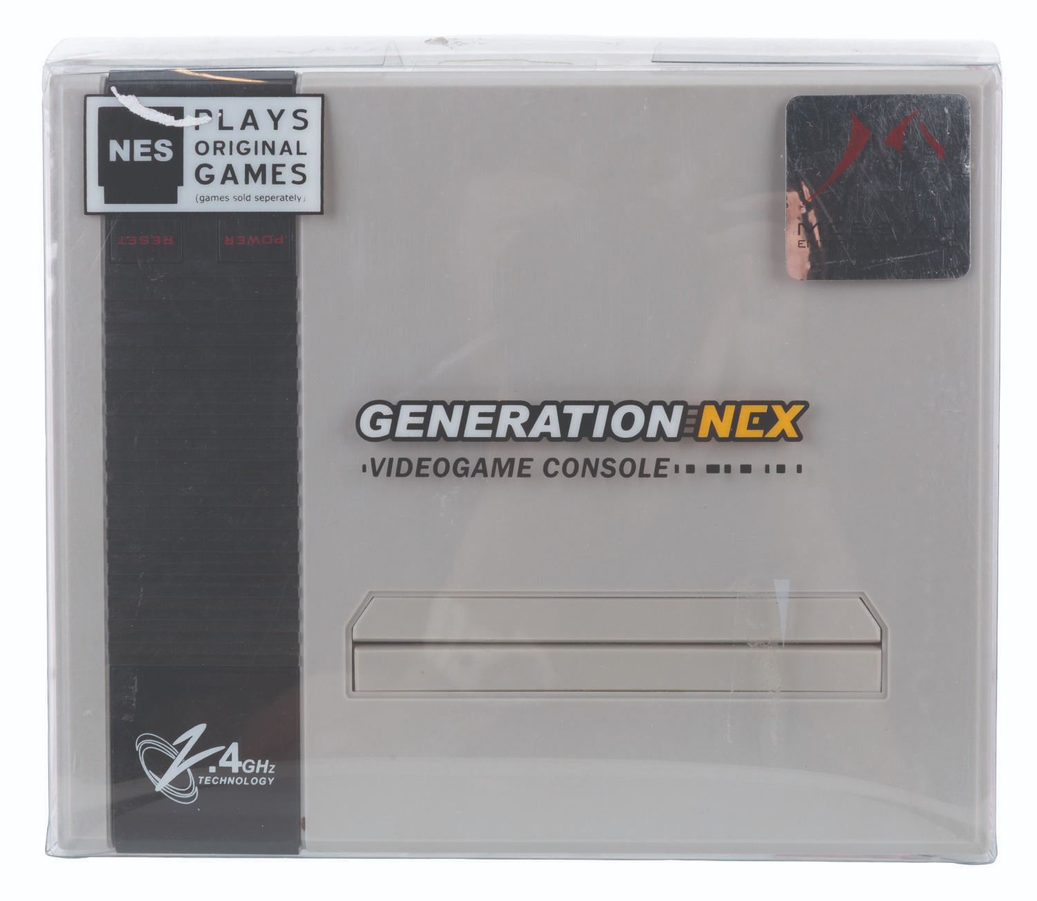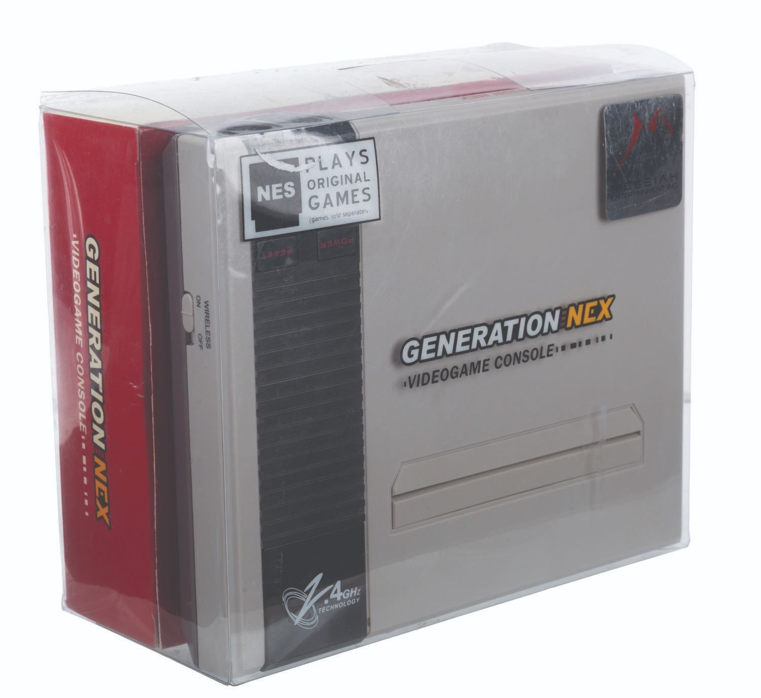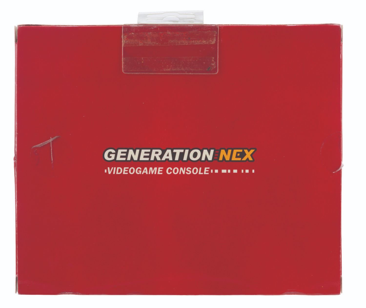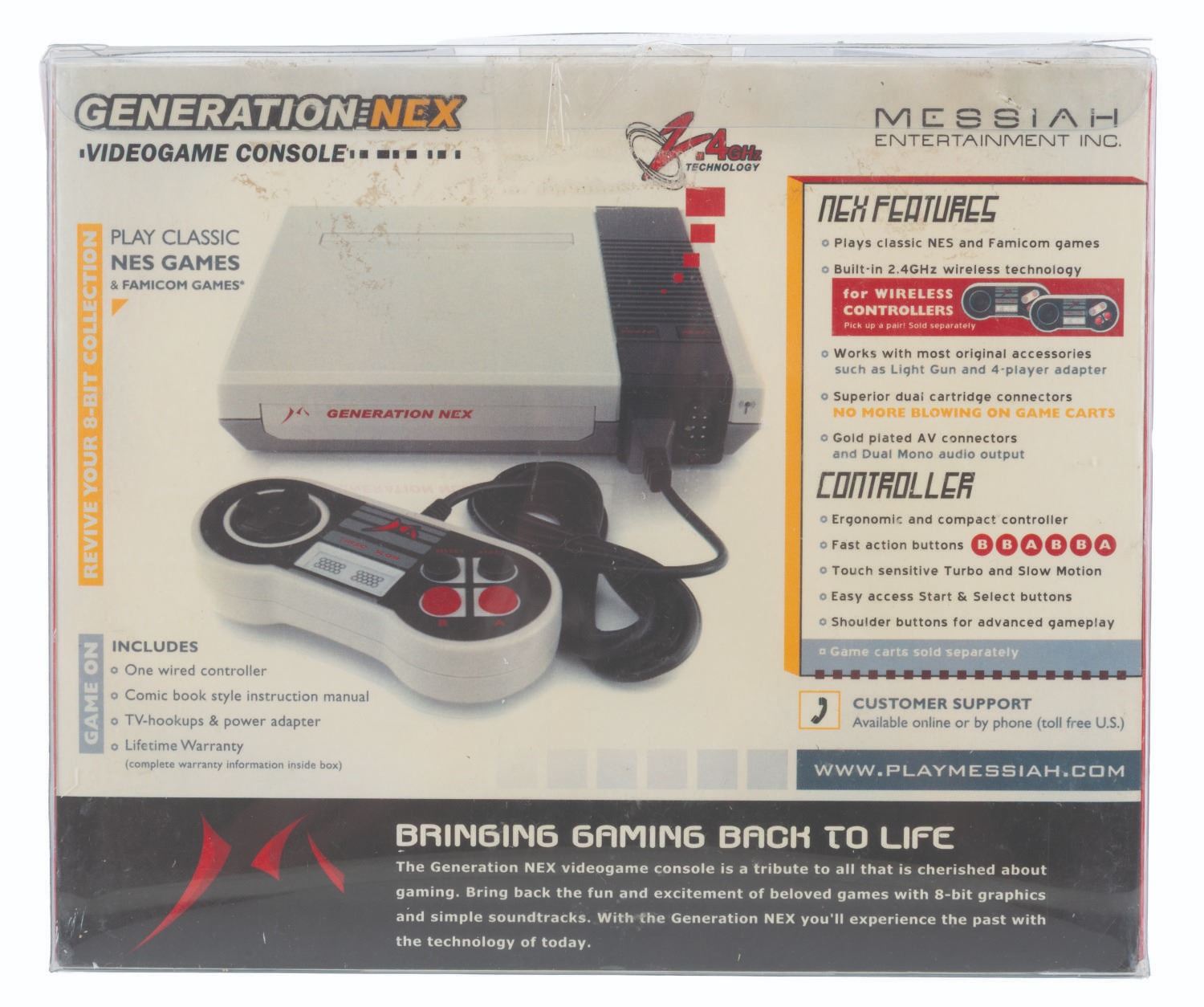 (Messiah Entertainment, 2005) A Generation NEX NES/Famicom hardware clone. Built around the infamous"Nintendo-On-A-Chip" technology, the console was designed to play legacy Nintendo Entertainment System and Japanese Famicom game cartridges. The console includes an AC adapter, composite cables and one controller. Operating with an AC adapter, the console is being sold in untested condition and may require service. Measuring 3.75" x 6.75" x 8" in its original box, the console is in good, used condition with light soiling and scuffs. The original box is in good condition with soiling, adhesive residue and edge wear.