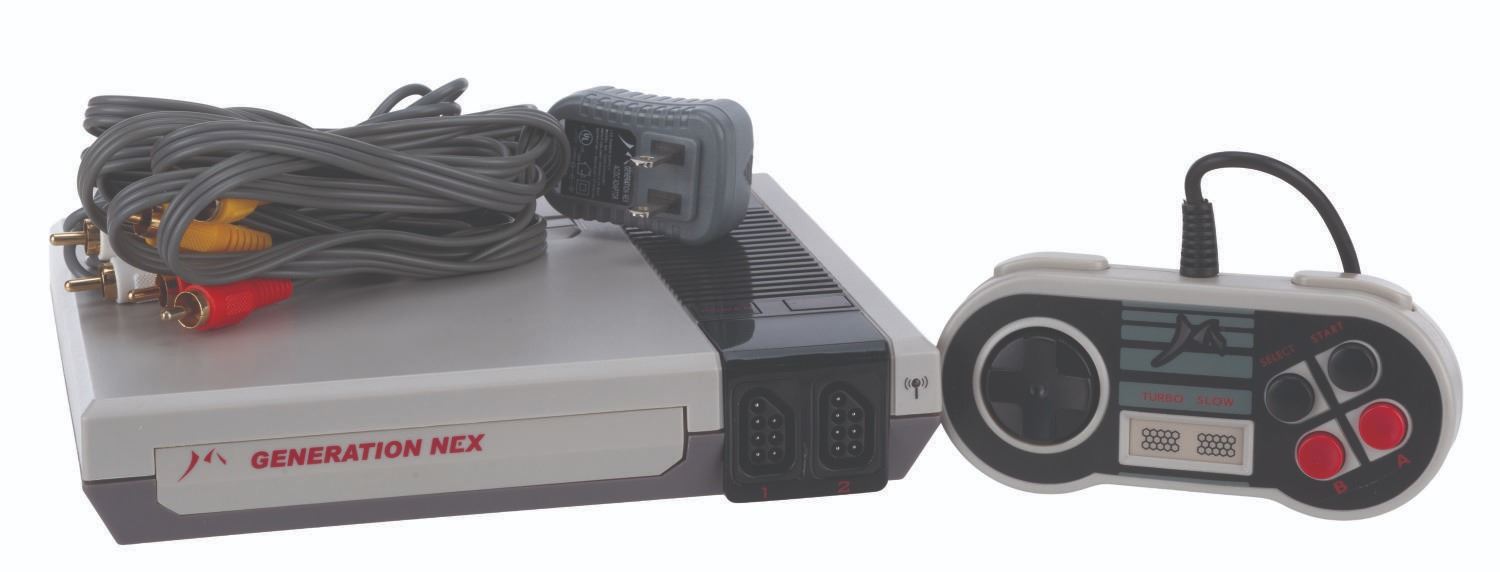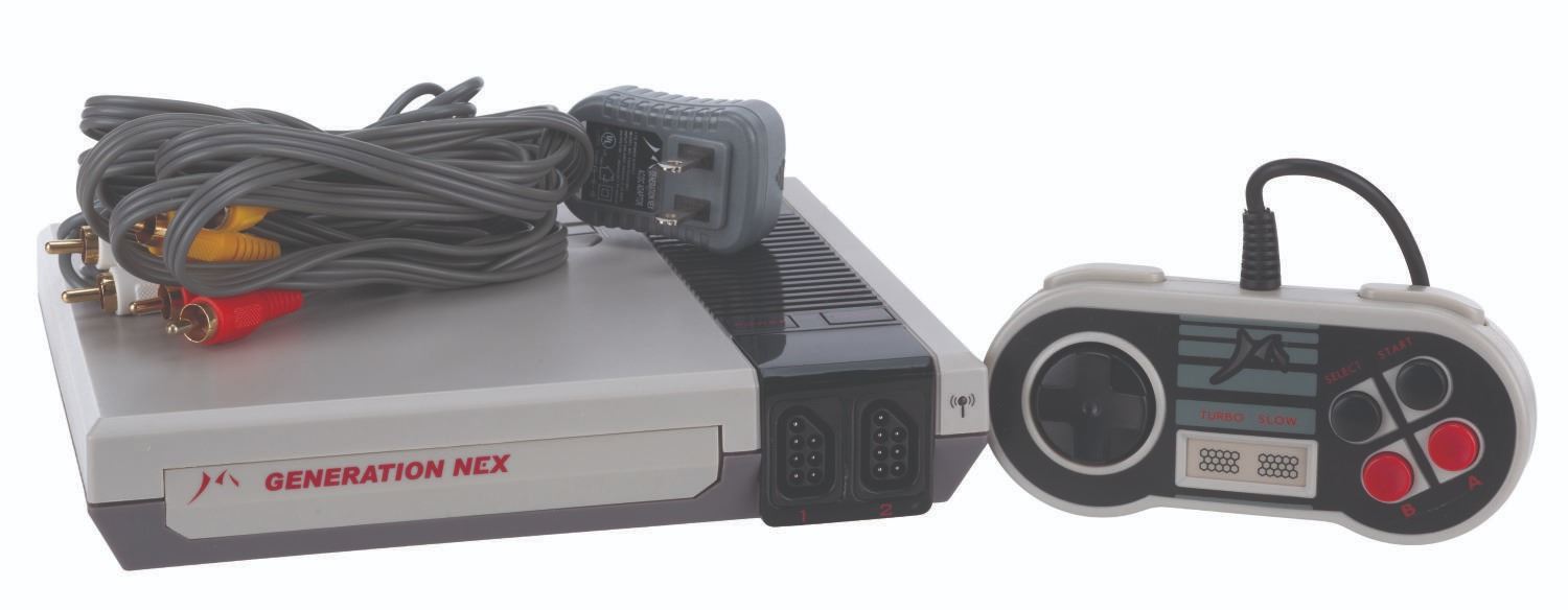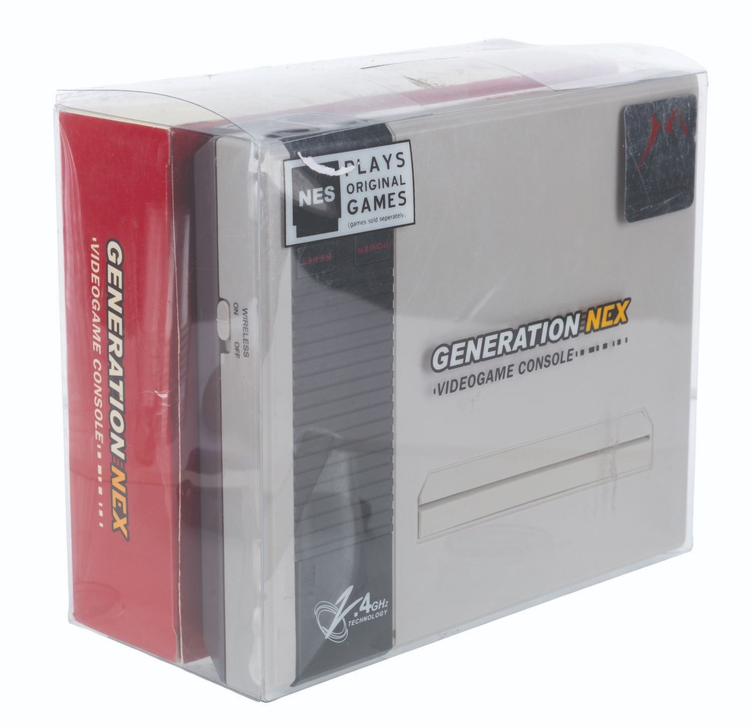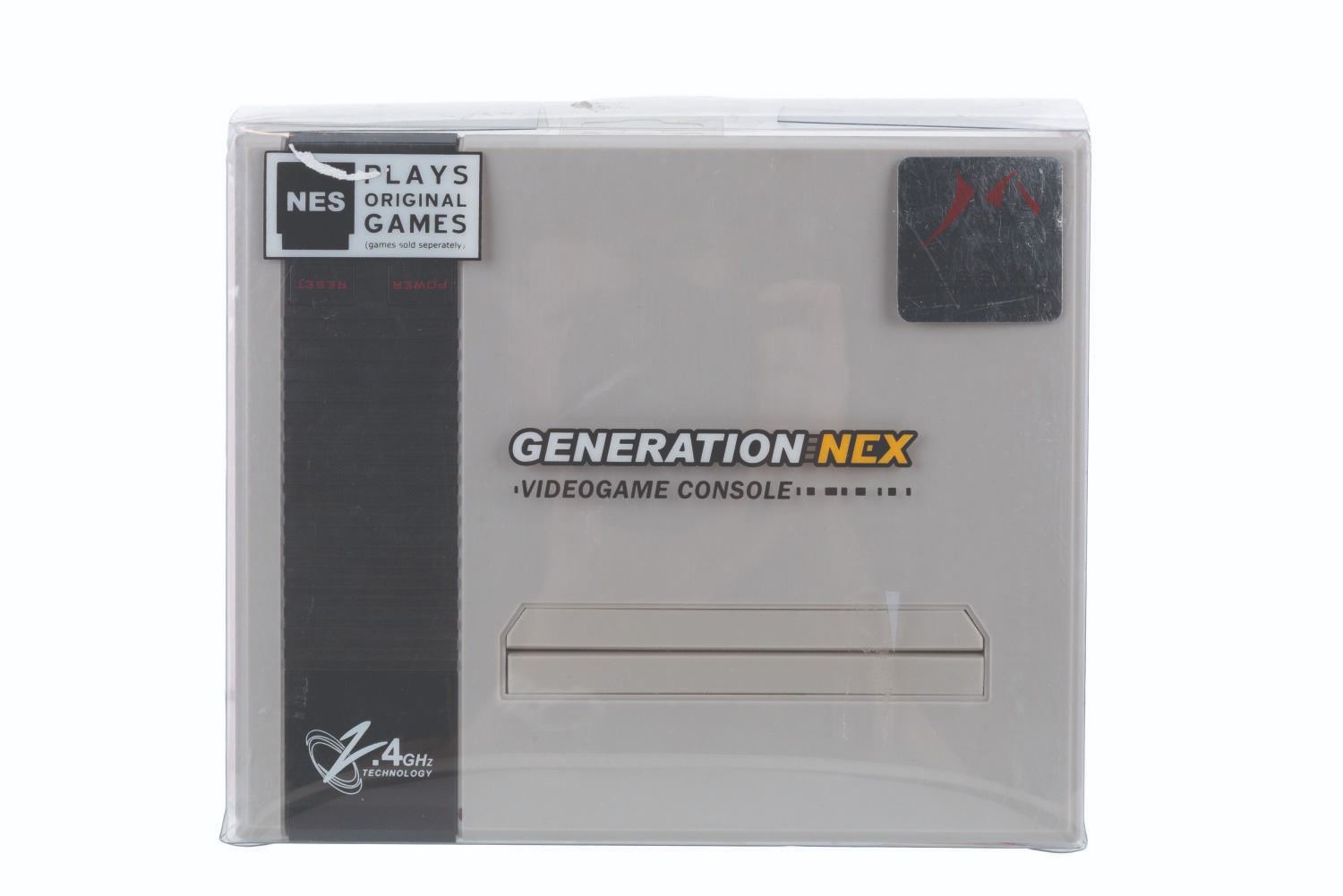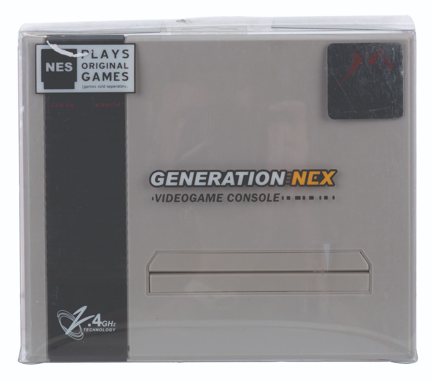 (Messiah Entertainment, 2005) A Generation NEX NES/Famicom hardware clone. Built around the infamous"Nintendo-On-A-Chip" technology, the console was designed to play legacy Nintendo Entertainment System and Japanese Famicom game cartridges. The console includes an AC adapter, composite cables and one controller. Operating with an AC adapter, the console is being sold in untested condition and may require service. Measuring 3.75" x 6.75" x 8" in its original box, the console is in good, used condition with light soiling and scuffs. The original box is in good condition with soiling, adhesive residue and edge wear.