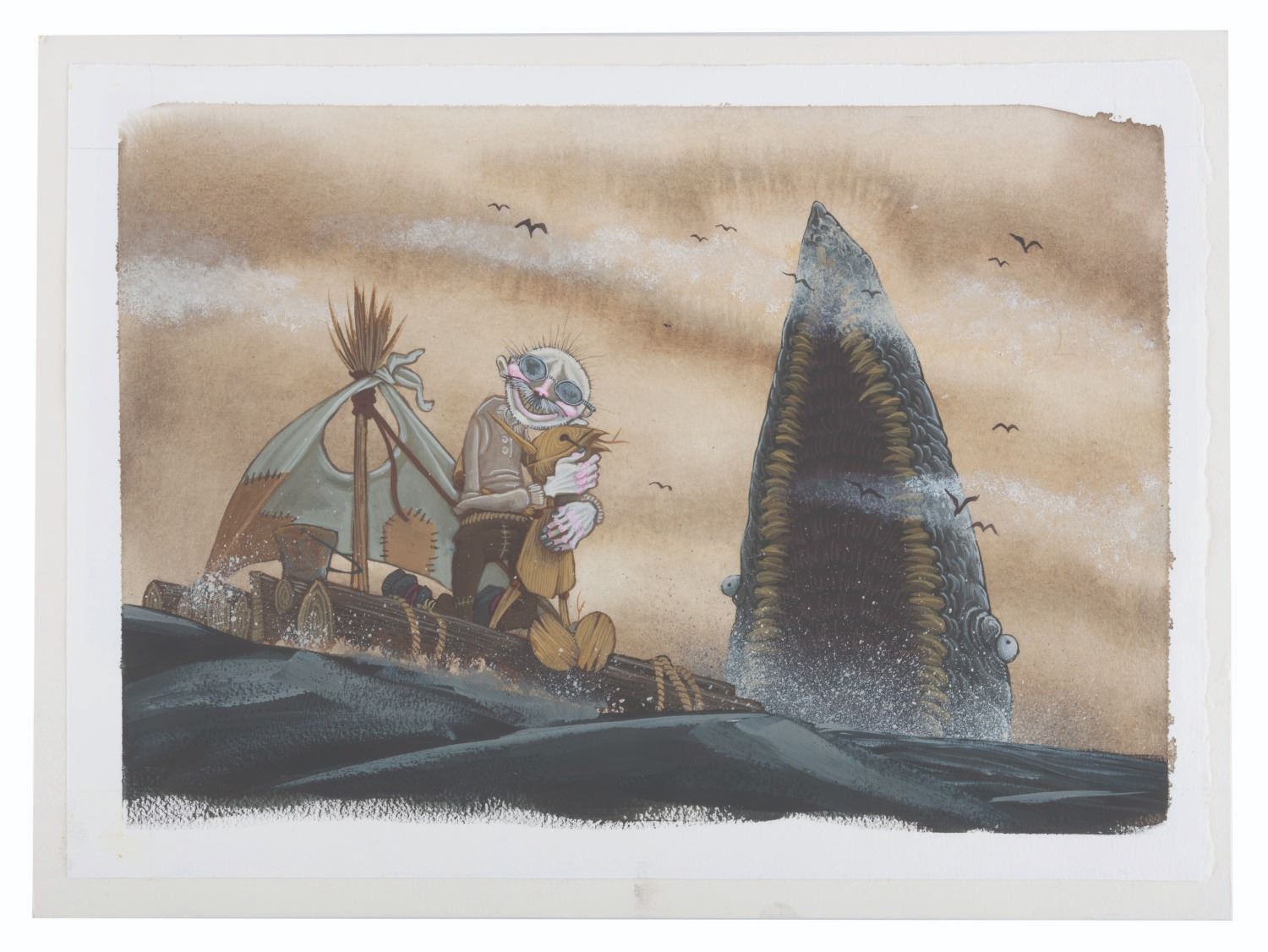 (Netflix, 2022) An original concept painting of Geppetto, Pinocchio, and the Terrible Dogfish by Gris Grimly for the Academy Award-winning animated film"Guillermo del Toro's Pinocchio." Grimly's breathtaking Pinocchio illustrations inspired the look of the stop-motion film, which was del Toros' lifelong passion project. The art has an image size of 9.75" x 13" on 10.25" x 13.75" illustration paper adhered to 11" x 15" cardboard. Accomplished in acrylic and watercolor, the art is in very good condition with edge wear, light smudges, and wear from production use.