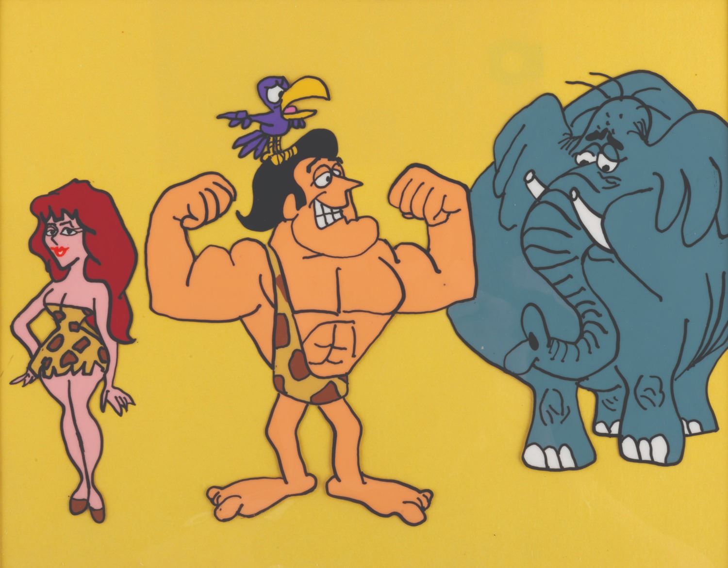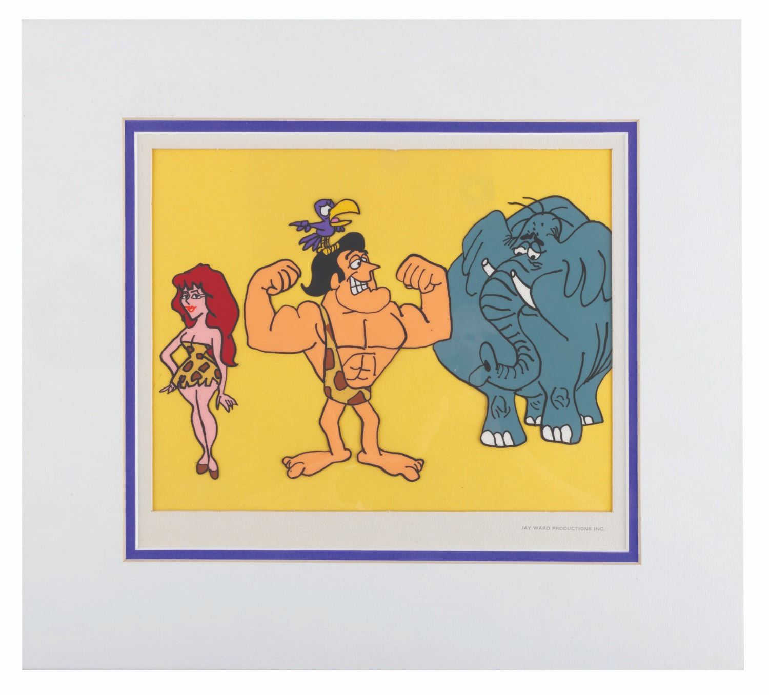 (Ward, 1989) Scene Cel #45 in the Jay Ward Productions Original Animation Scene Cels Collection, featuring George of the Jungle, Ursula, Tookie Tookie, and Shep. The characters have an image size of 6" x 8.75" in a 7" x 9" visible cel. The entire matted piece measures 12.5" x 14". The art is in very good condition with scratches and a stray mark on the left side which does not affect the image.