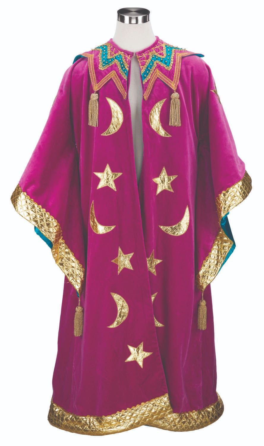 (EPCOT Center, 1983) A large celestial cloak and striped shirt worn by the Dreamfinder audio-animatronic on Journey Into Imagination. Dreamfinder wears this fortune teller outfit before the final scene, as he gazes into a crystal ball and talks about the importance of imagination. Maintaining their original EPCOT Center labels marked "Imag. #10," the costume pieces are in good to very good condition with heavy stains on the interior of the shirt, discoloration from age, pilling, fraying, and wear from Park use.