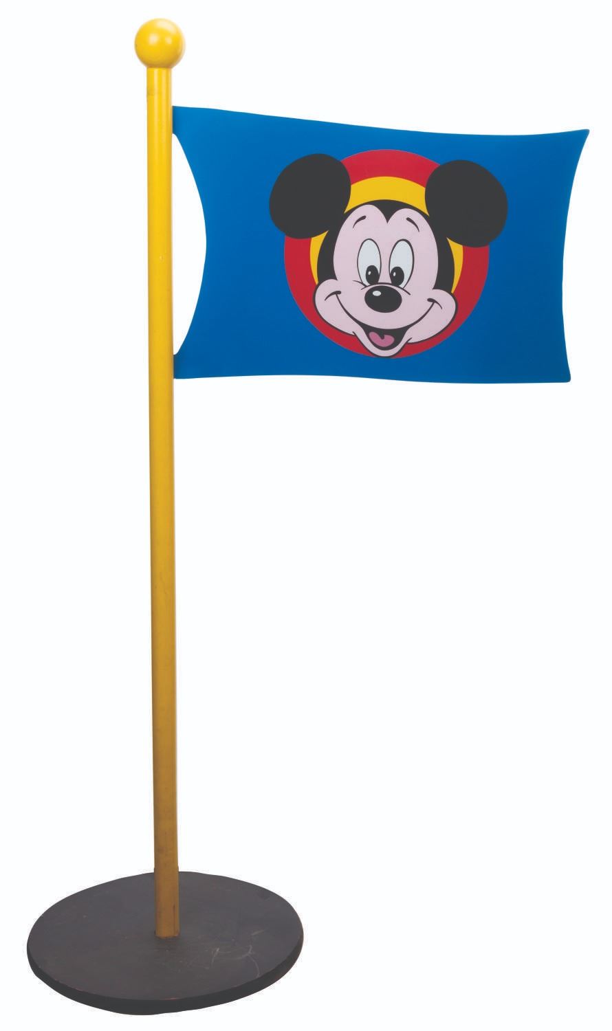 (Disney, 1980s-90s) A large double-sided Mickey Mouse flag, likely used for a Disney display in a store. The metal flag is attached to a metal pole and housed in a wooden base. Measuring 25.5" x 58" tall and 17.5" in diameter, the flag displays in good condition with paint chips, scratches, scuffs, and wear.