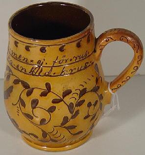 with underglazed incised bird / floral designs and calligraphic Dutch lettering around the collar, dated "1909", having a caramel outer glaze and chocolate inner glaze, height 6".