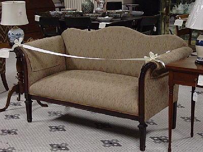 in the Sheraton manner, carved mahogany frame, length 60", circa 1881, newly custom upholstered in a flame fabric.