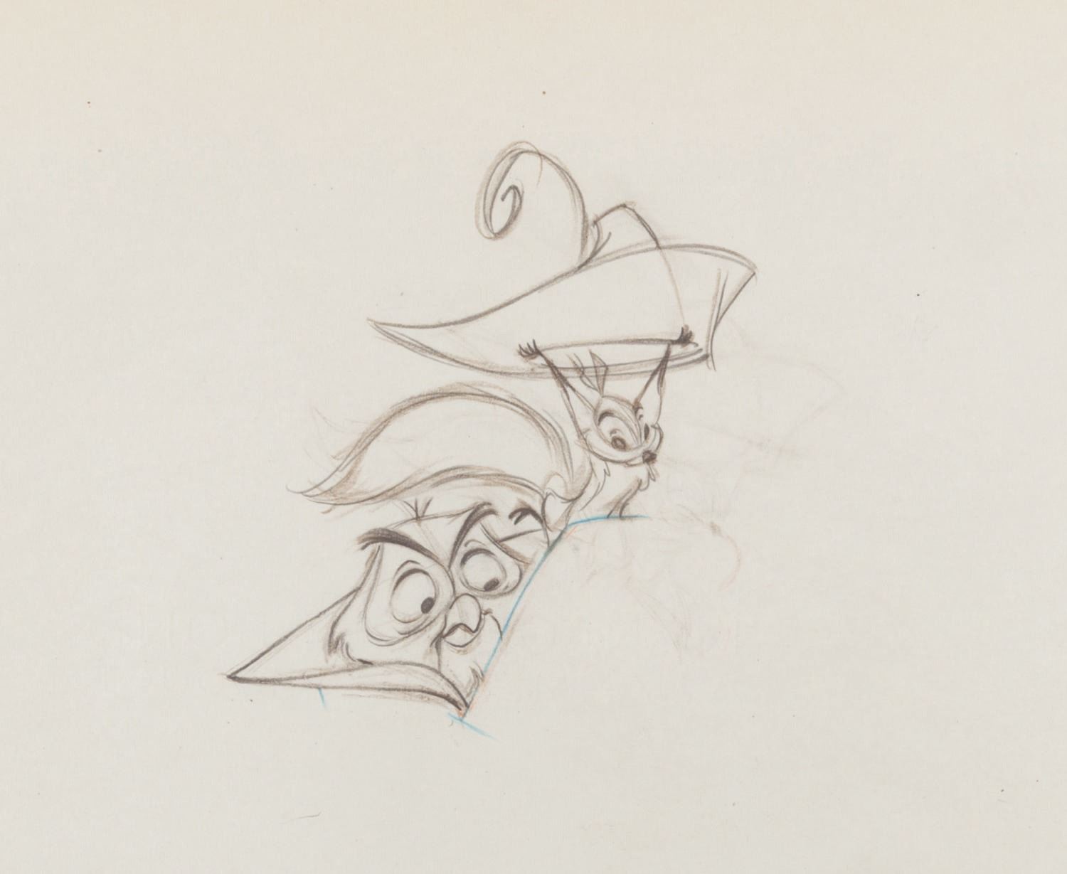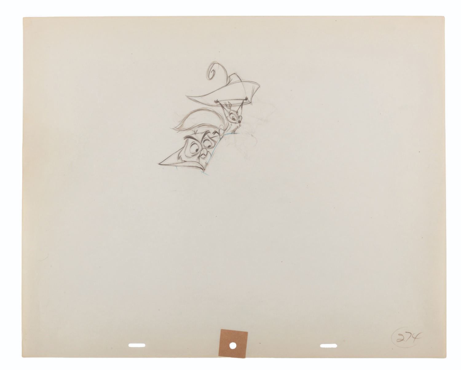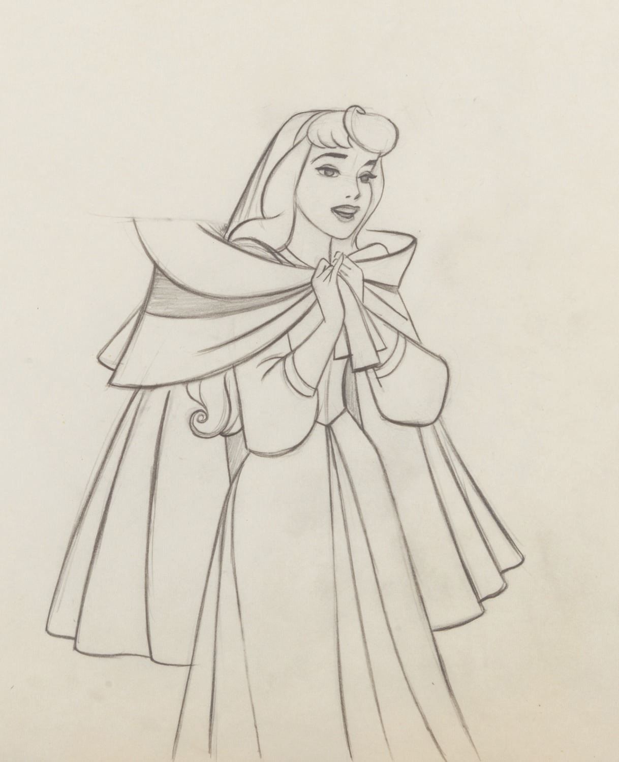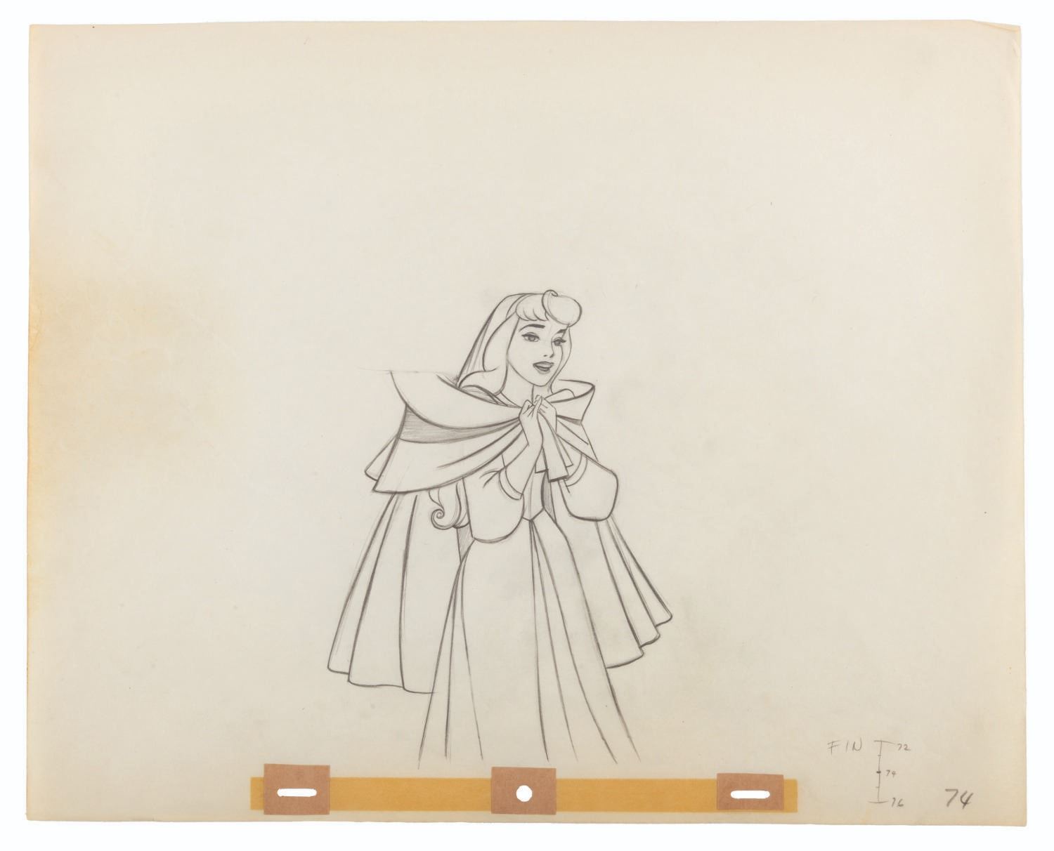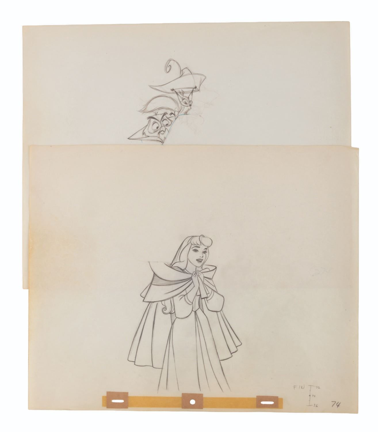 (Disney, 1959) A pair of production drawings of Briar Rose and the Mock Prince from Walt Disney's masterpiece"Sleeping Beauty." With image sizes ranging from 3.5" x 4" to 5.25" x 7.5" on 12.5" x 15.5" animation paper, the graphite drawings are in good to very good condition with creases, edge wear, and discoloration from age, notably on the left side of the Briar Rose drawing.