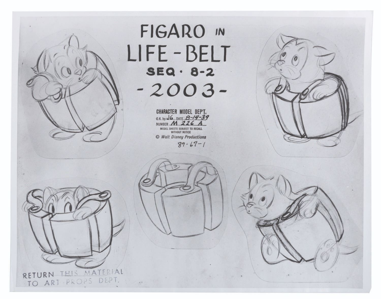 (Disney, 1940) A Studio-produced photostat model sheet of Figaro in a lifebelt from"Pinocchio." Model sheets like this were distributed to animators on a film to ensure everyone drew the character consistently. Measuring 11" x 14", the model sheet is in very good condition with minor discoloration, rippling, and edge wear from age and handling.
