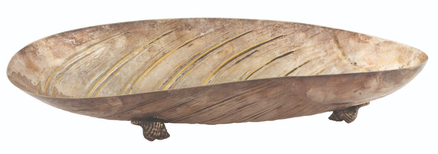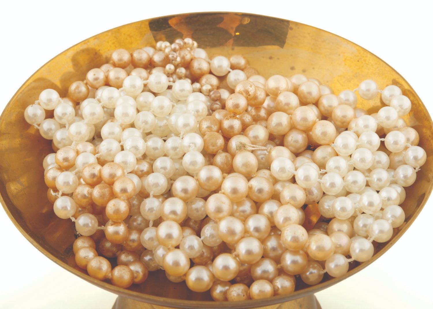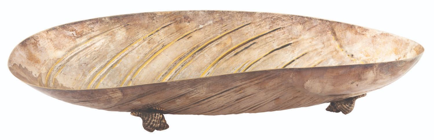 (Disney, 2003) A collection of Isla de Muerta treasure props from"The Curse of the Black Pearl." Included are two serving trays, a clamshell-shaped serving bowl, and two bags of pearl props. Ranging in size from 5" x 6" pearl bags to the 7" x 15.5" x 3.25" serving bowl, the props are in good to very good condition with oxidation from age, a dent on the tall serving tray, and light wear from production use. \