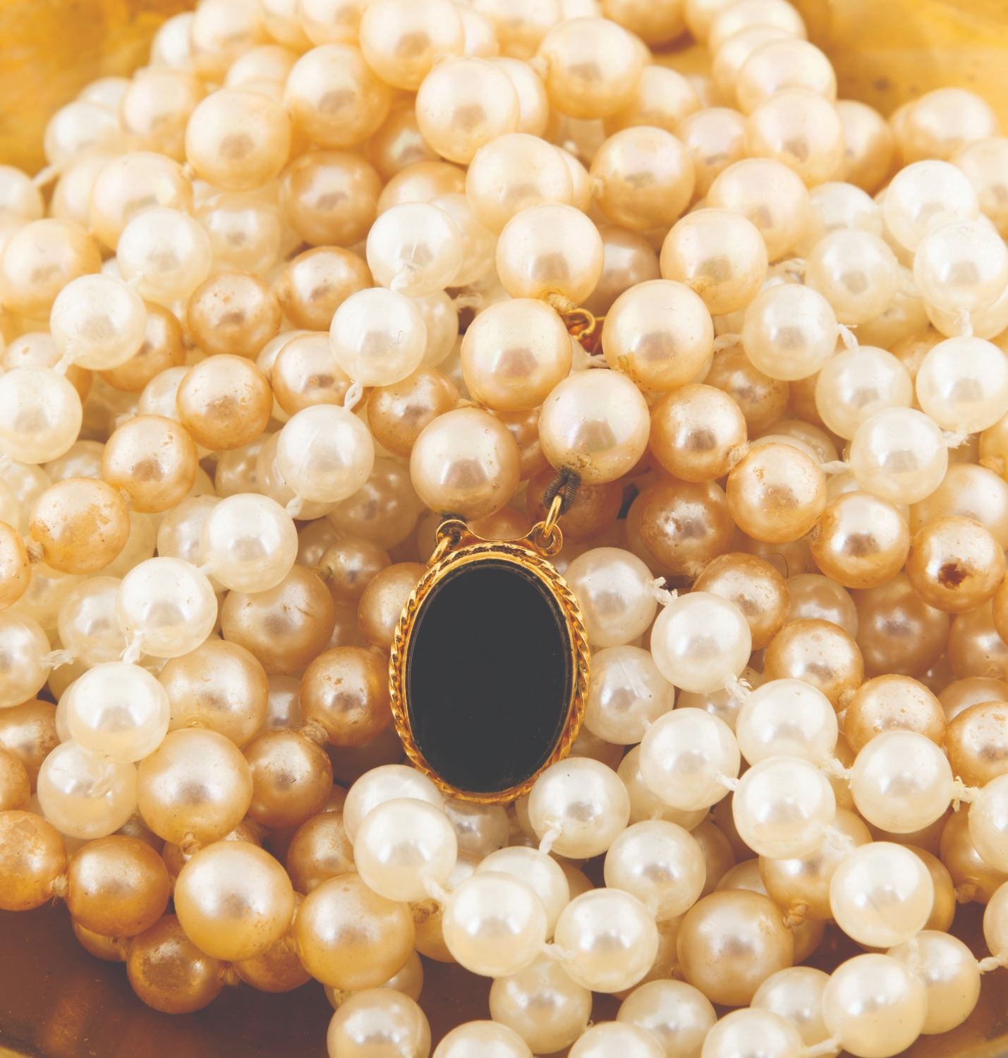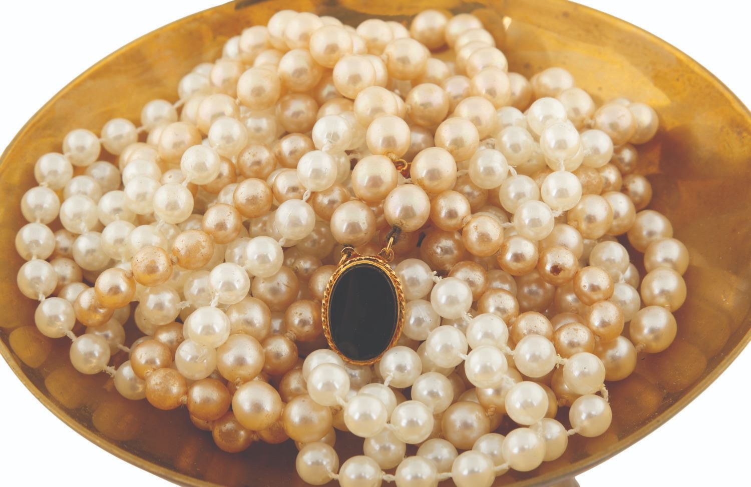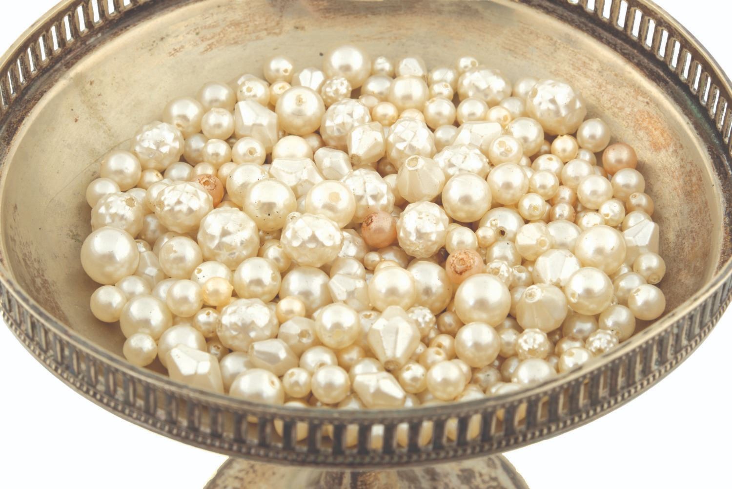 (Disney, 2003) A collection of Isla de Muerta treasure props from"The Curse of the Black Pearl." Included are two serving trays, a clamshell-shaped serving bowl, and two bags of pearl props. Ranging in size from 5" x 6" pearl bags to the 7" x 15.5" x 3.25" serving bowl, the props are in good to very good condition with oxidation from age, a dent on the tall serving tray, and light wear from production use. \