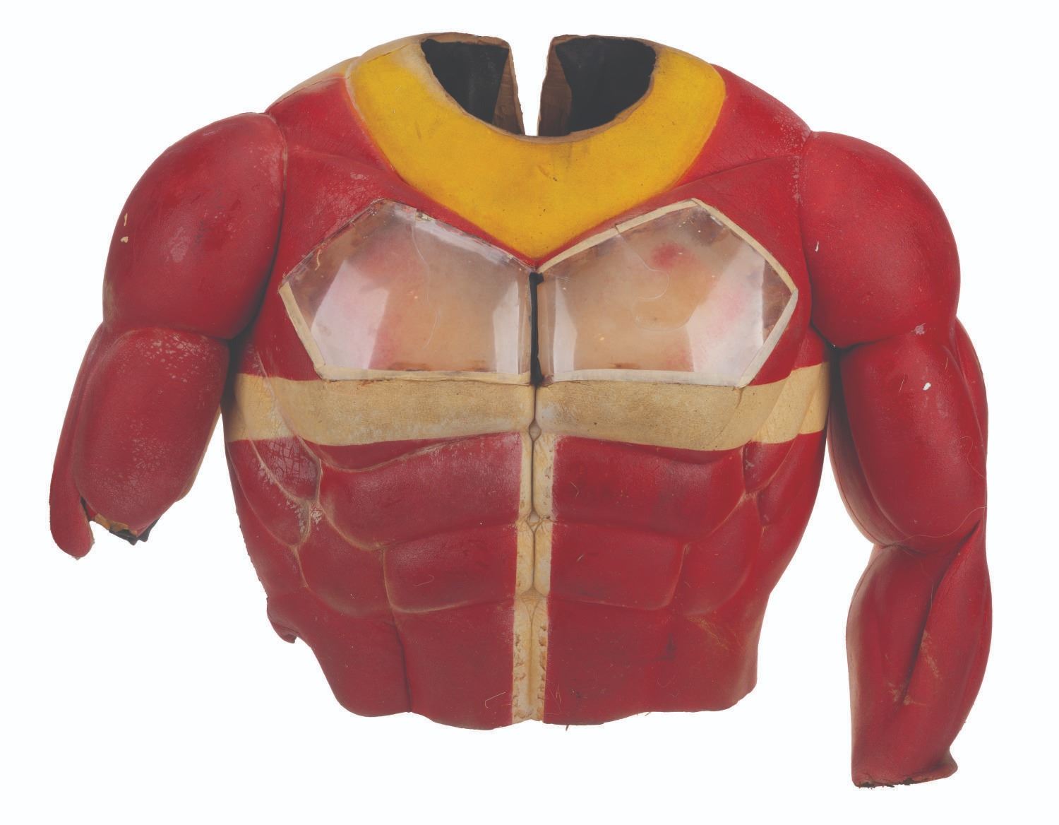 (Saban, 1998) A prototype Red Power Ranger Battlizer armor costume built by the Chiodo Brothers for the"Power Rangers in Space" series. The enhanced armor first appeared in the "Mission to Secret City" episode, where the Red Ranger transforms into the Battlizer form to fight the evil Vacsacker. The prototype armor, crafted from foam, plastic, and Vacu-form, features nine enhancement parts and leather gloves and was used to develop the final screen-used costume. Measuring 10" x 22" x 24", the armor and enhancement parts are in good, production-used condition with cracked, missing, and degraded foam, paint loss and transfer to adjoining surfaces, soiling, discoloration, cracked plastic features, and parts sticky to the touch.