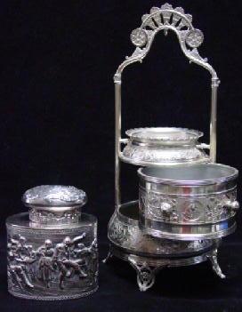 , footed, circa 1870's-1880's, together with an oval silver plated on copper tea caddy with repousse work obverse and reverse of dancing couple in a tavern-like setting.