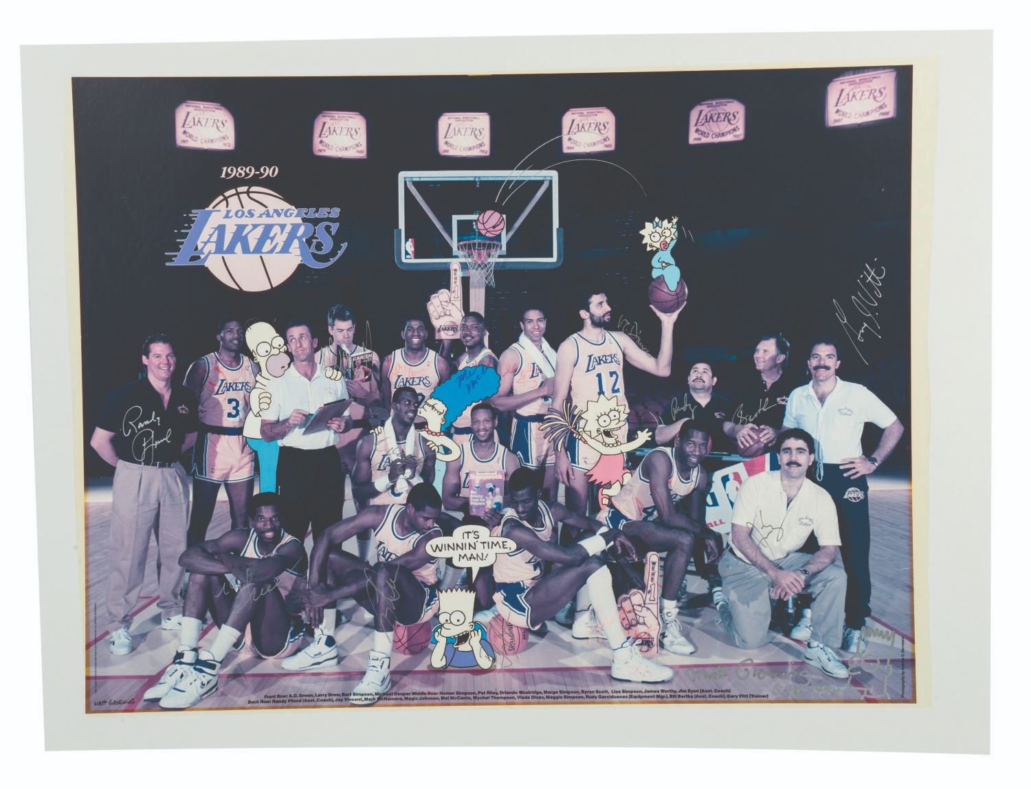 (Fox/NBA, 1990) An extremely rare "It's Winnin' Time" poster featuring the 1989-1990 Los Angeles Lakers and"The Simpsons." The poster is signed by the entire Lakers 1989-1990 team and coaching staff, including Magic Johnson, as well as the show's creator, Matt Groening, who also drew a Bart Simpson in the bottom right-hand corner. Only 10 of these posters were made, exclusively given to Gracie Films and FOX executives, and this is the only one we have ever seen offered up for sale. This encapsulation of the year 1990 in pop culture is an essential item for serious collectors of both"The Simpsons" and sports memorabilia. With an image size of 20" x 26" adhered to a 22.5" x 28" board, the poster is in very good condition with light bubbling and minor wear.