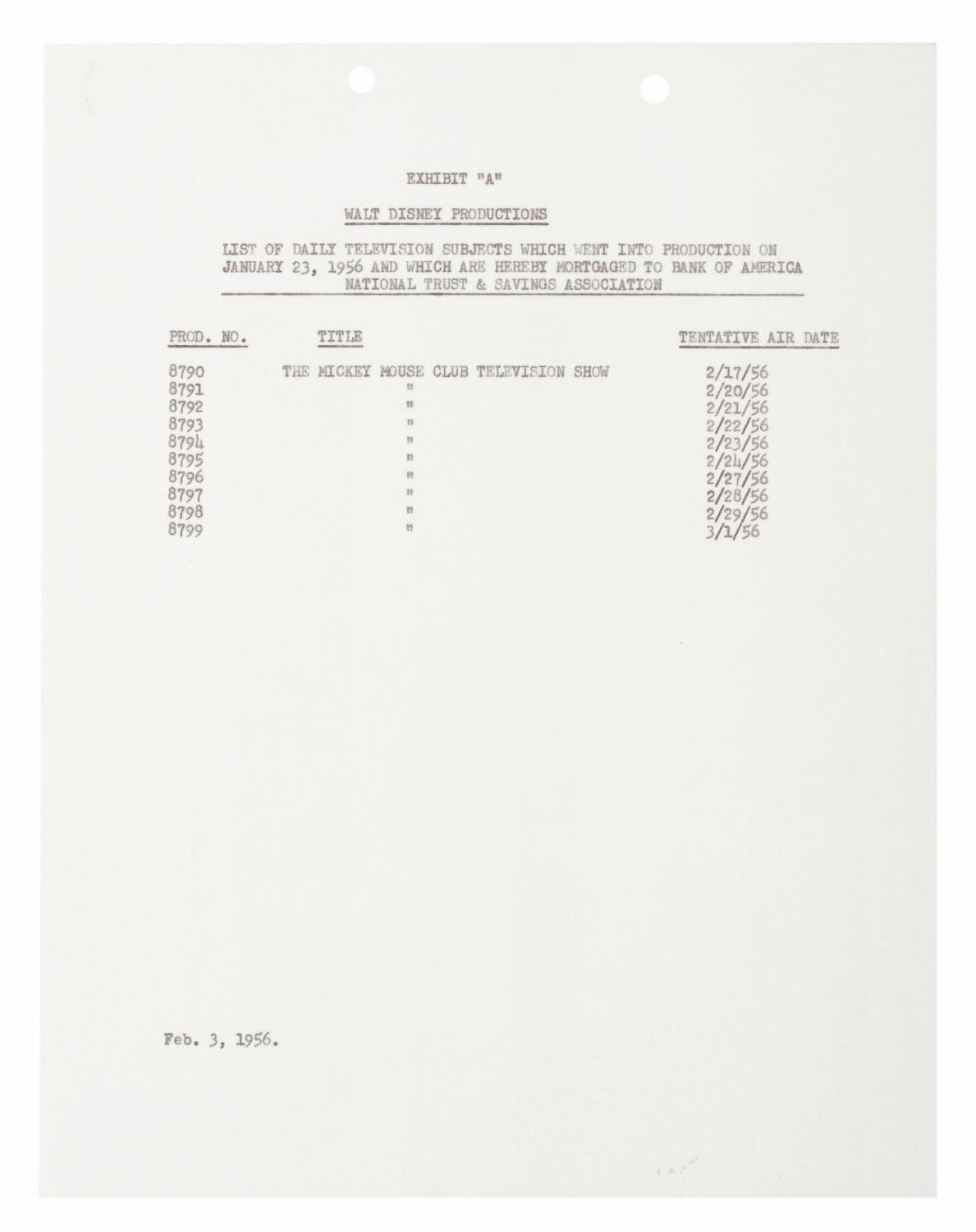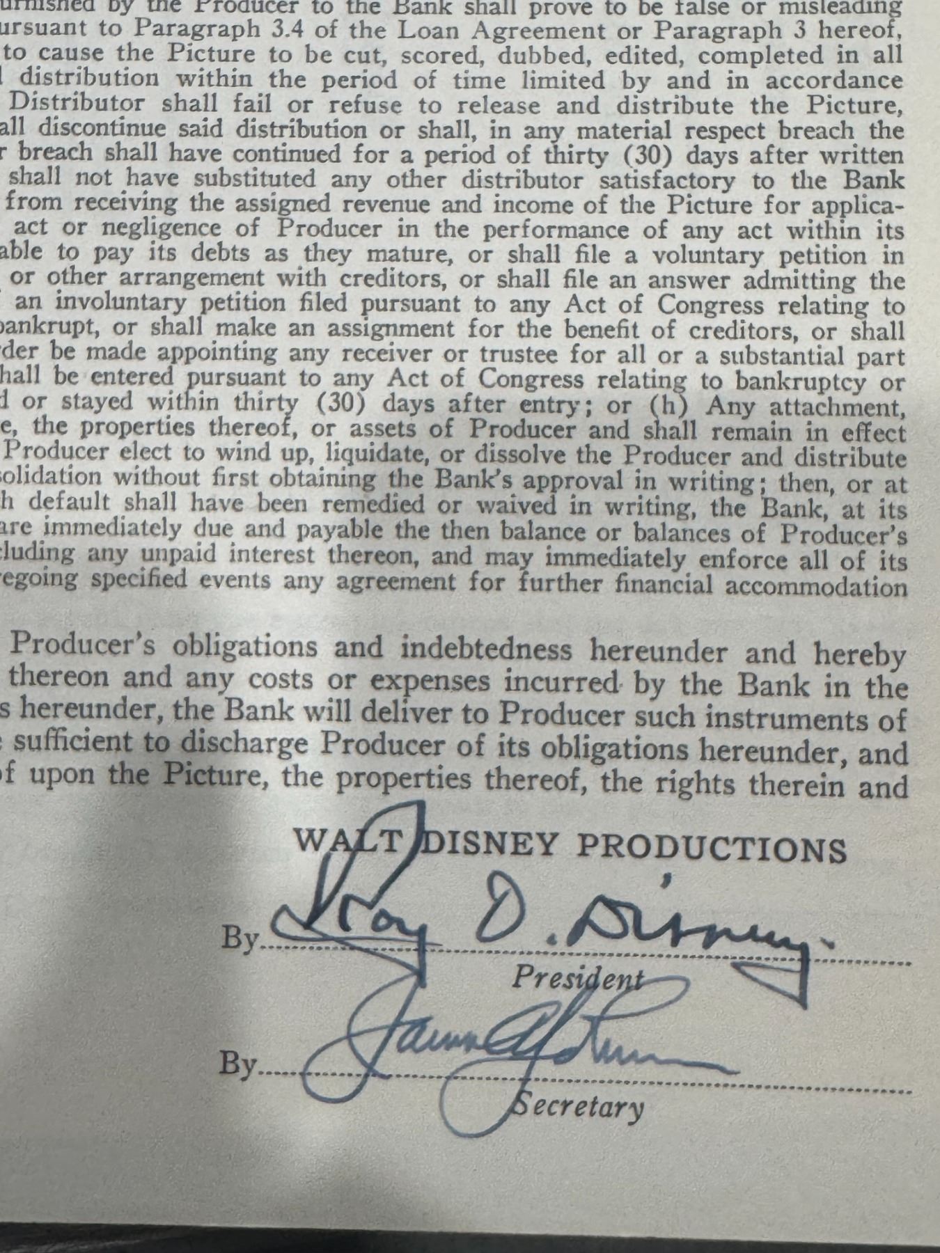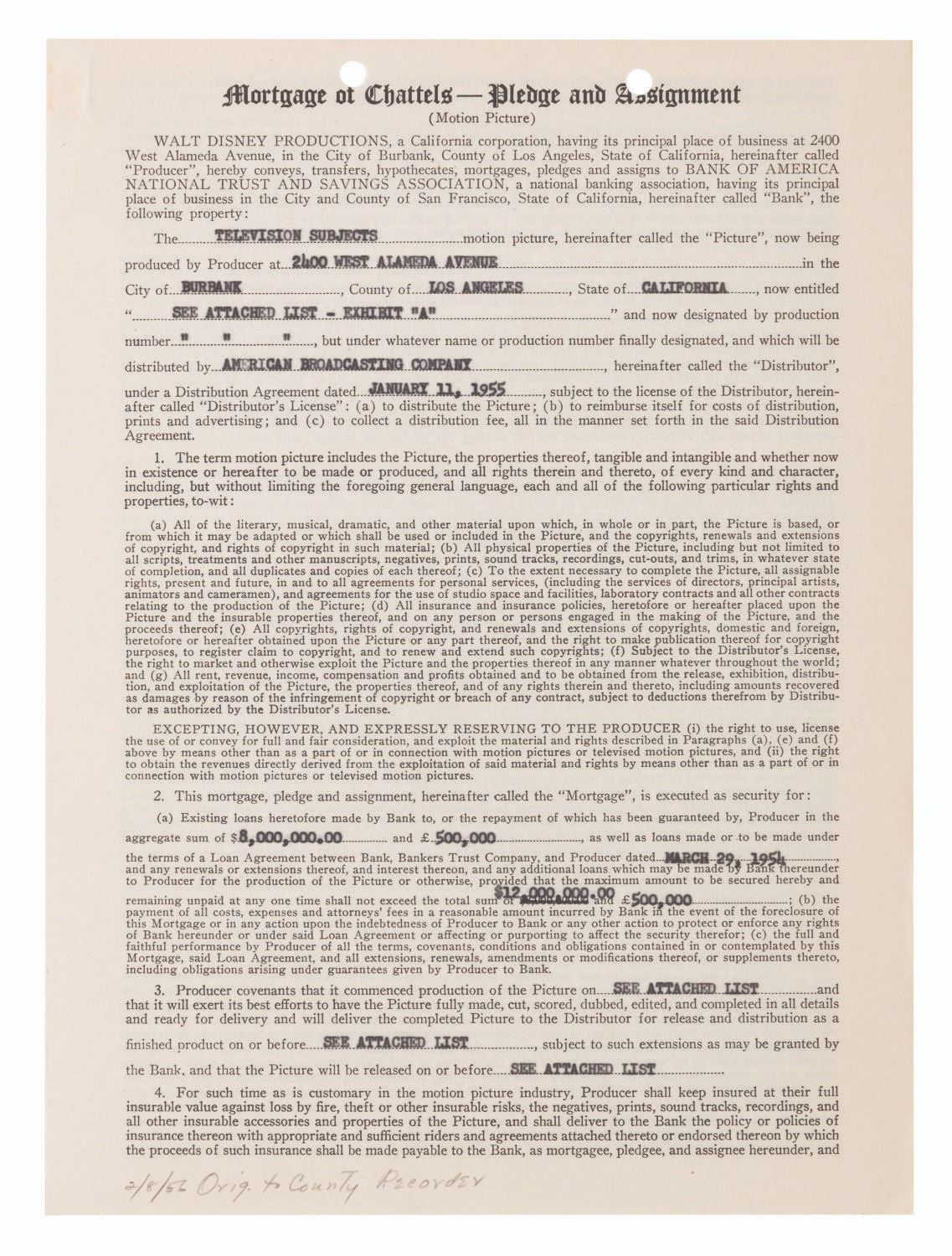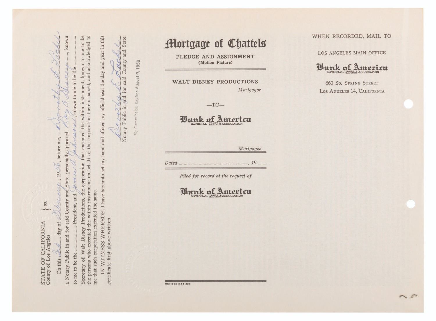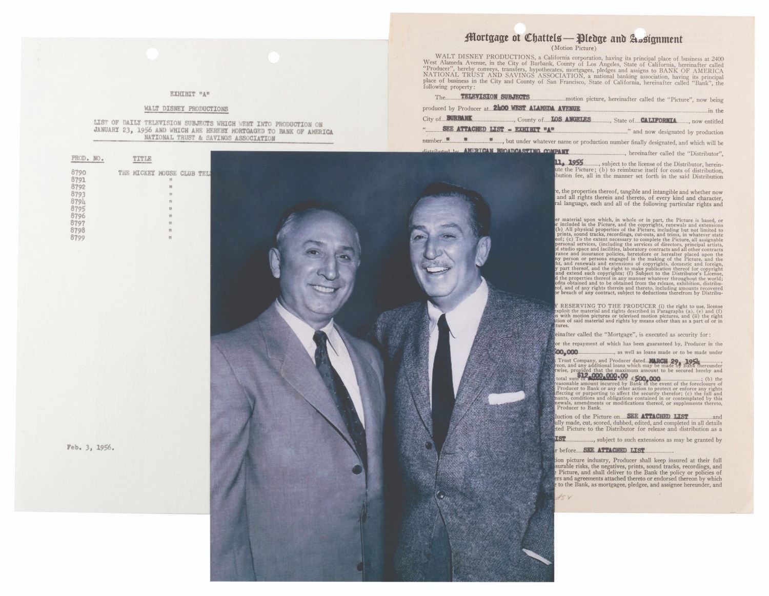 (Disney, 1956) A Roy O. Disney signed Mortgage of Chattels document. The mortgage not only secured existing loans but also funded the production of"The Mickey Mouse Club" television show, with the show itself serving as collateral for the loan. Measuring 8.5" x 11.5" the 3-page document is in very good condition with light edge wear and oxidation around an original staple. Also included is an 8" x 10" photo of Walt and Roy O. Disney, in fine condition.