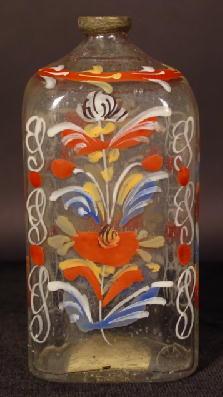 floral motifs, with pewter rims, height 5 1/8", ascribed to be a "Bride's Bottle", circa late 18th C./early 19th C., (German or American markings).