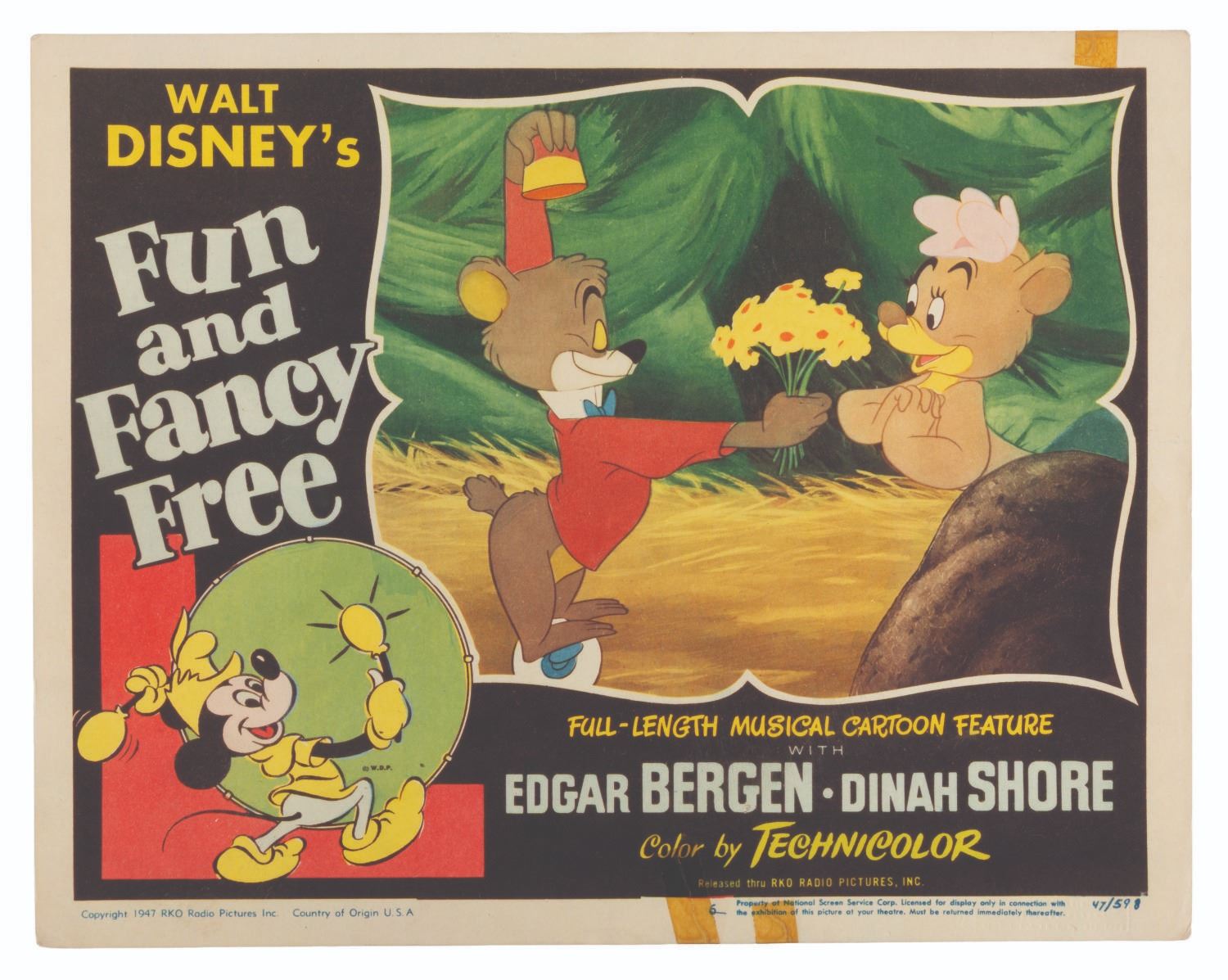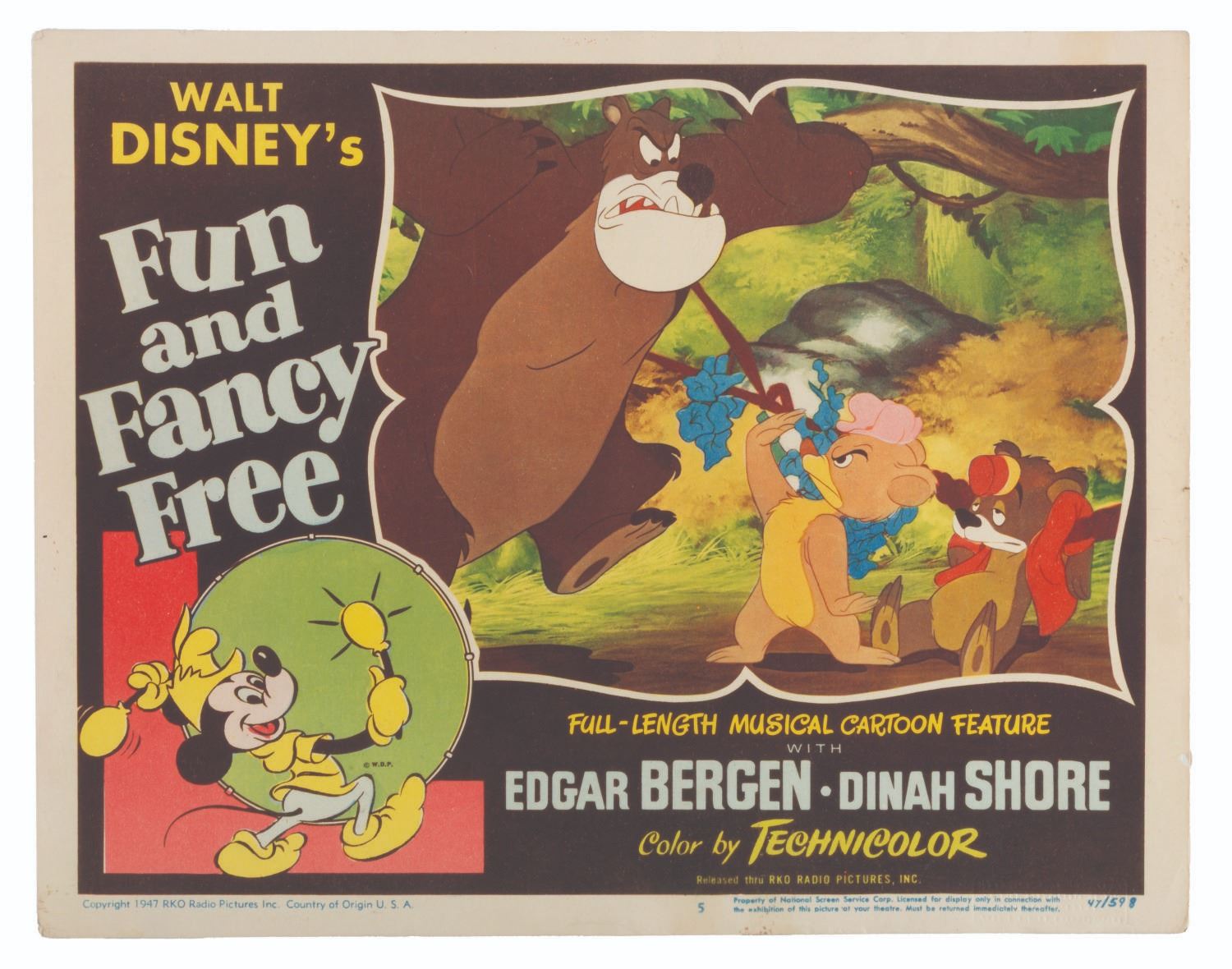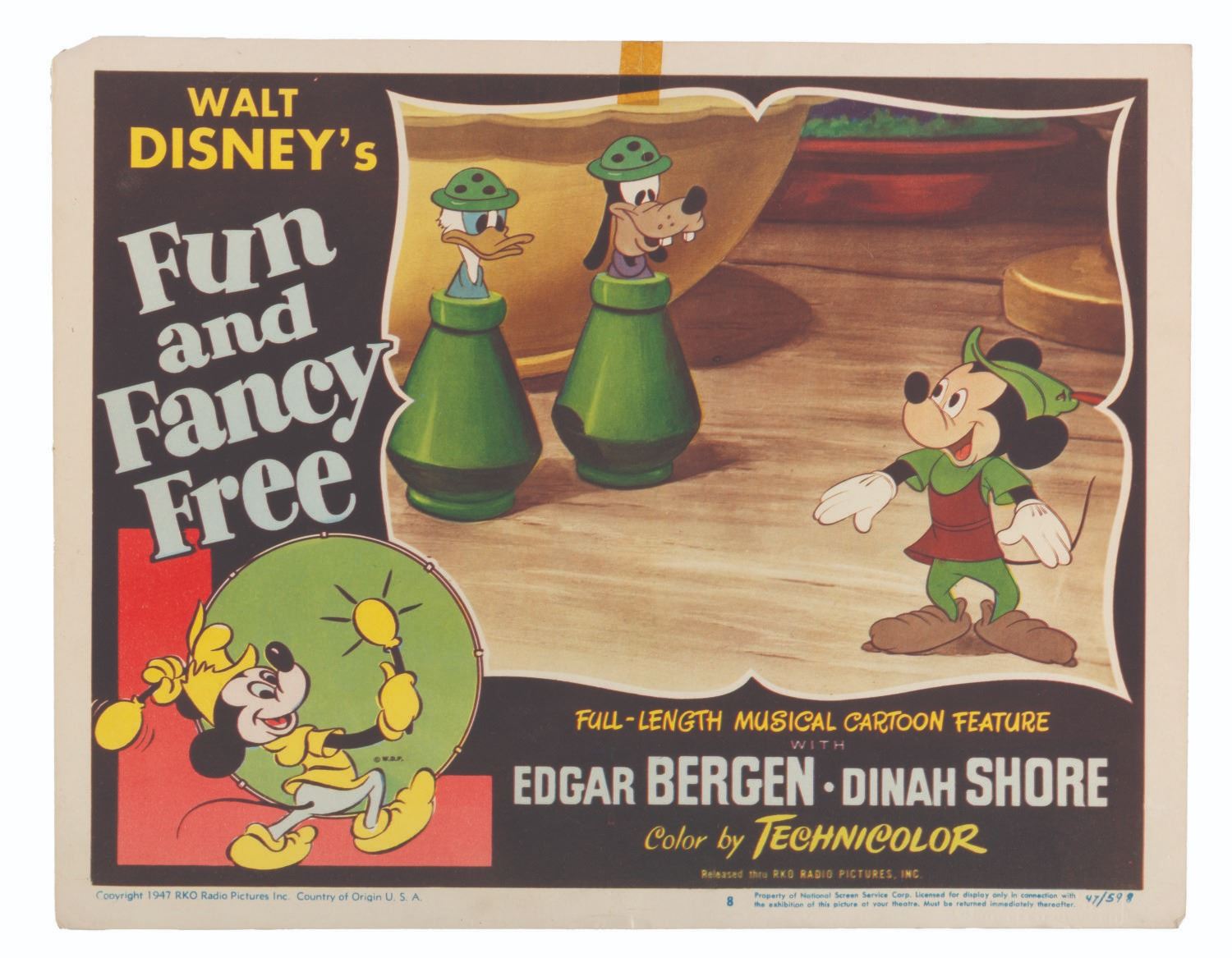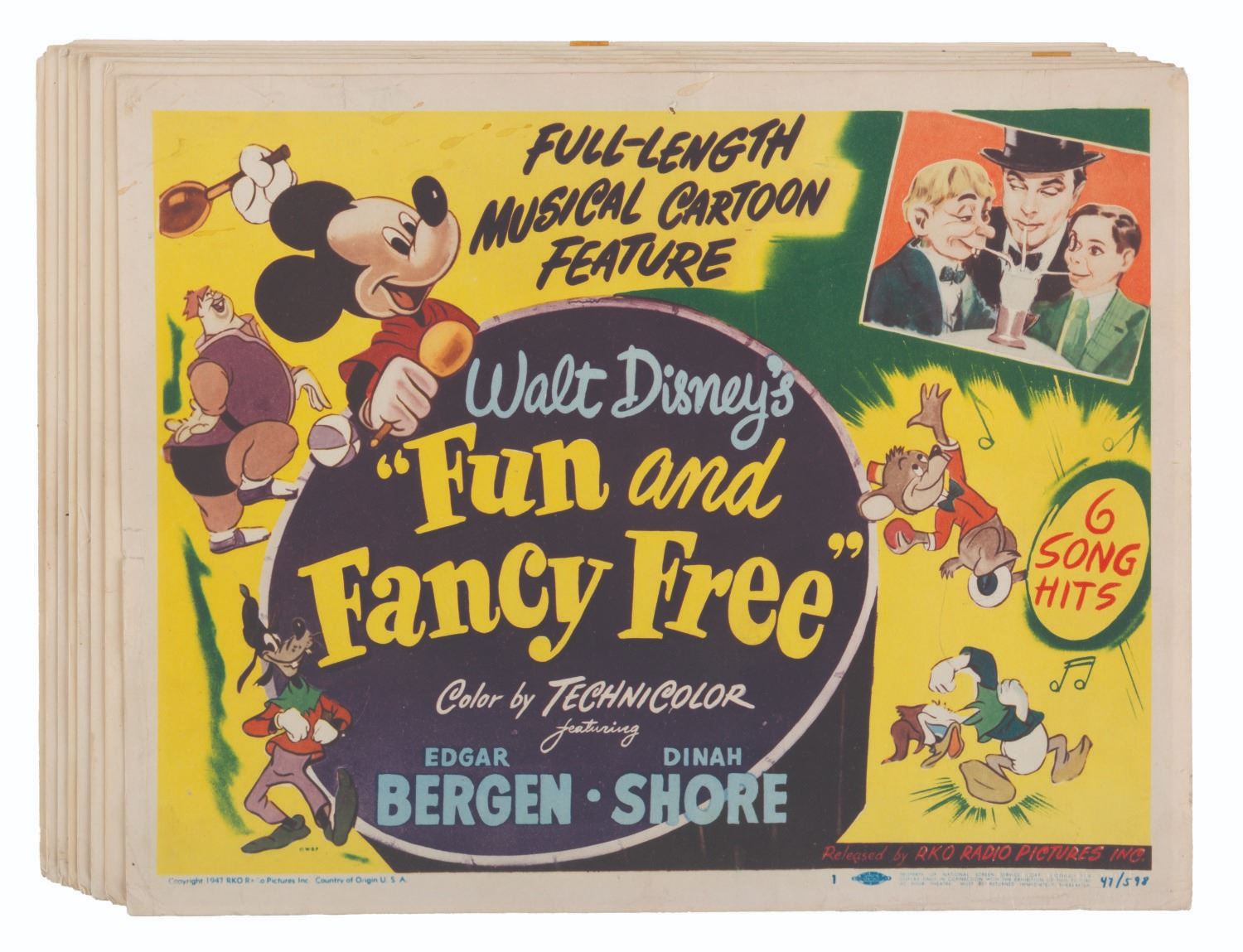 (Disney, 1947) A set of eight lobby cards for Walt Disney's animated anthology"Fun and Fancy Free." Measuring 11" x 14" each, the cards are in fair to good condition with edge wear, creases, stains, scuffs, scrapes, discoloration from age, and tape and adhesive residue.