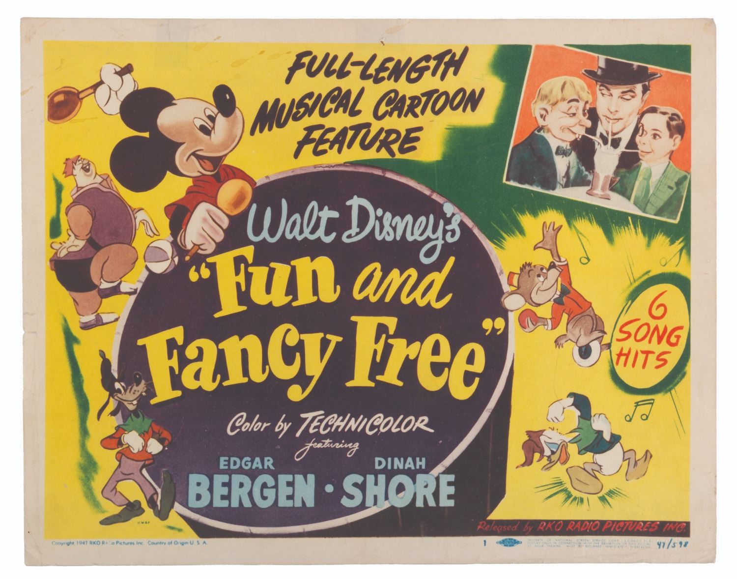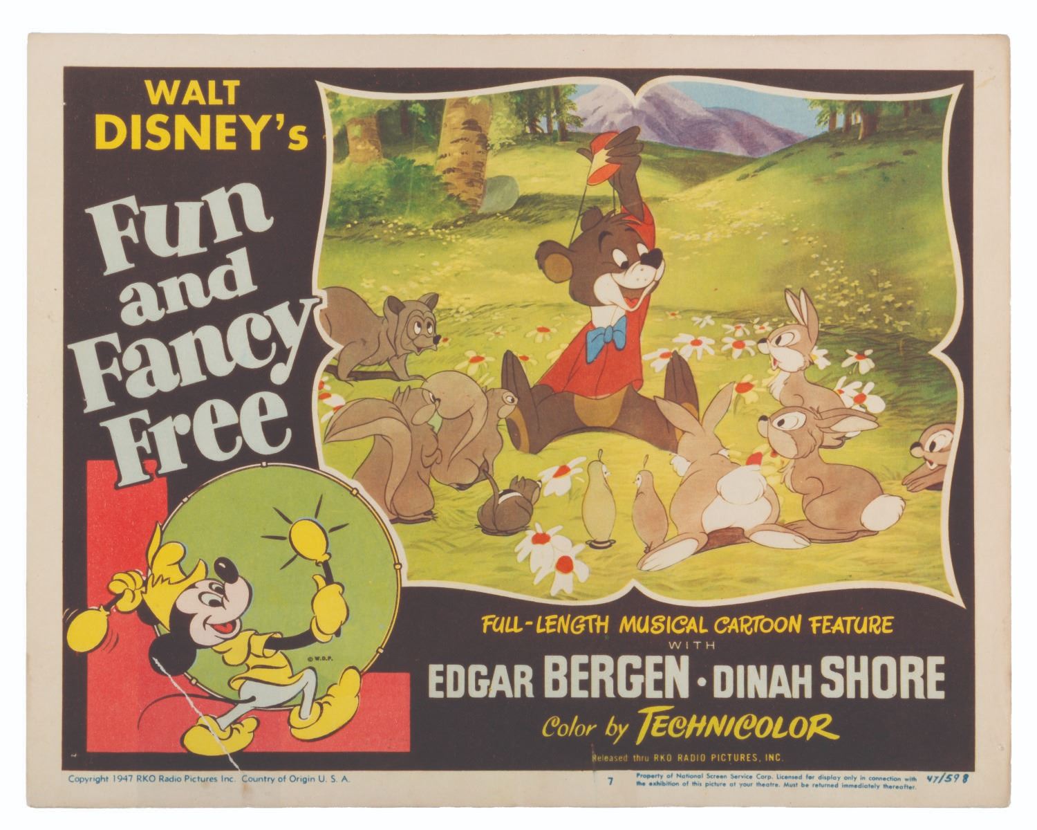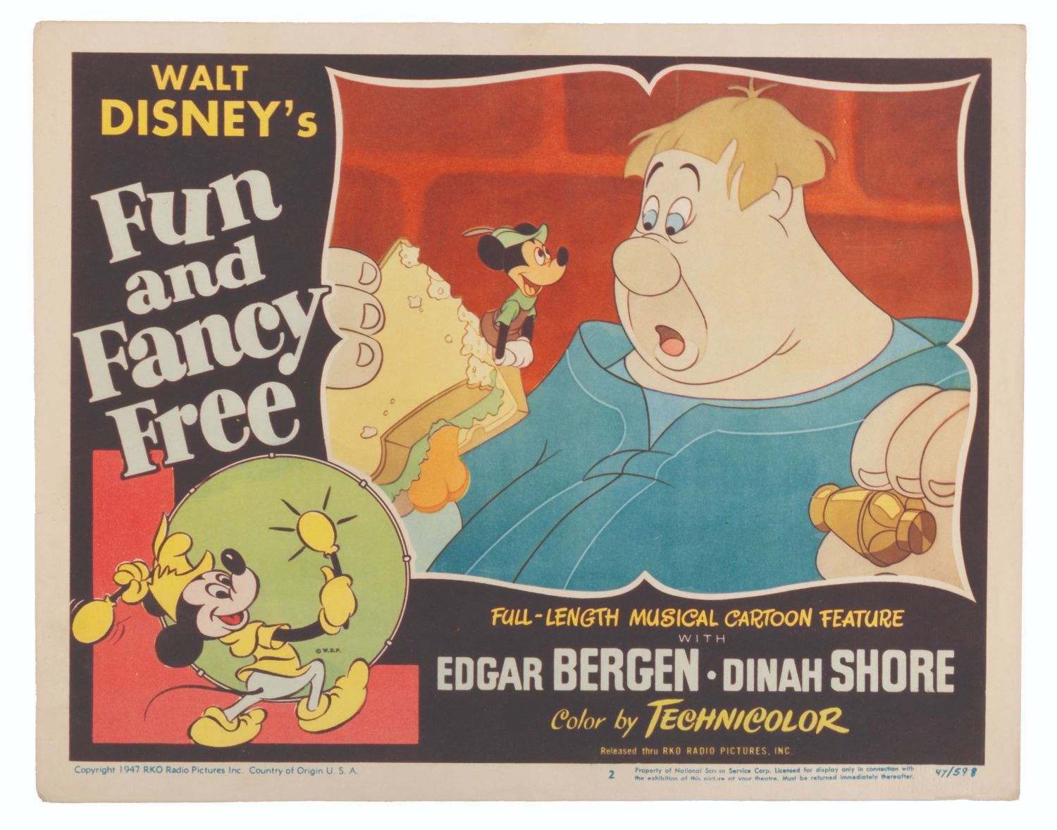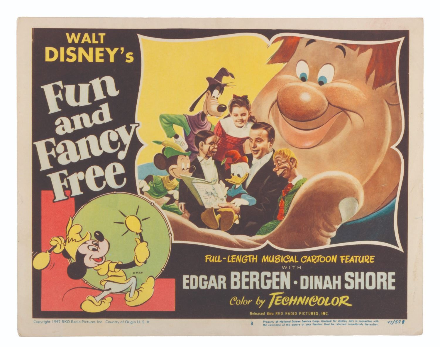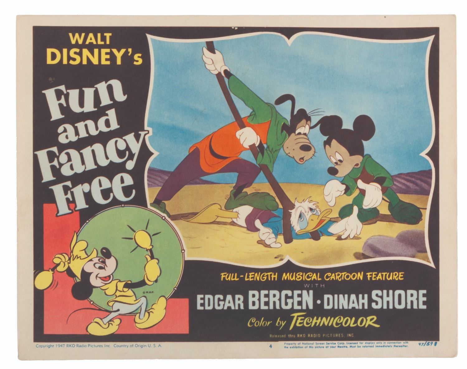 (Disney, 1947) A set of eight lobby cards for Walt Disney's animated anthology"Fun and Fancy Free." Measuring 11" x 14" each, the cards are in fair to good condition with edge wear, creases, stains, scuffs, scrapes, discoloration from age, and tape and adhesive residue.