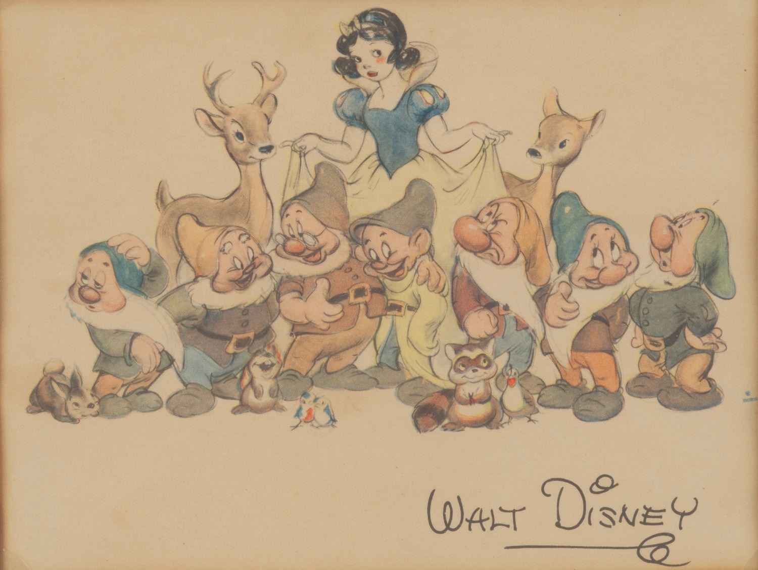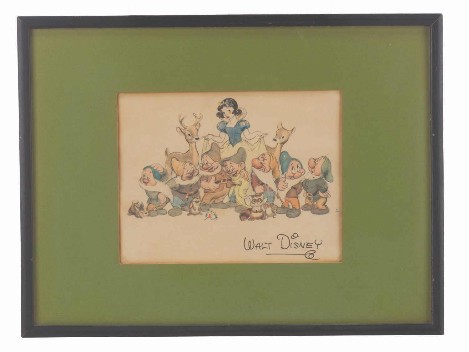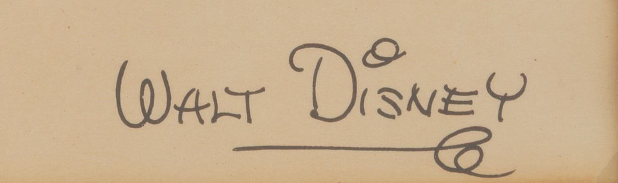 (Disney, 1930s-40s) A framed Studio fan card for"Snow White and the Seven Dwarfs," featuring a facsimile Walt Disney signature. Cards like this one were mailed to fans who requested them. With an image size of 5" x 8" in a 6.75" x 8.75" visible window and 12.75" x 16.75" framed, the fan card displays in very good condition with discoloration from age and light handling wear.