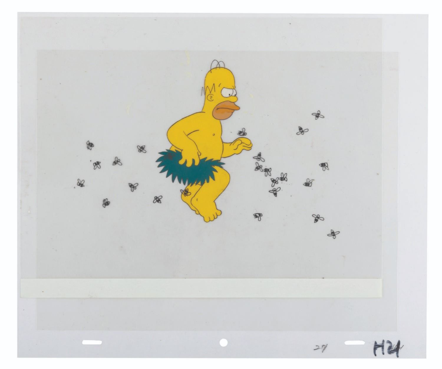 (20th Century Fox, 1990) An original multi-layer production cel of Homer Simpson from"The Simpsons," season one episode"The Call of the Simpsons." Homer and the Bees measure 3" x 5" and 2.5" x 7.5" on 10.5" x 12.5" and 8.5" x 10.75" animation cels. The cels are in good condition with light soiling and scuffing.