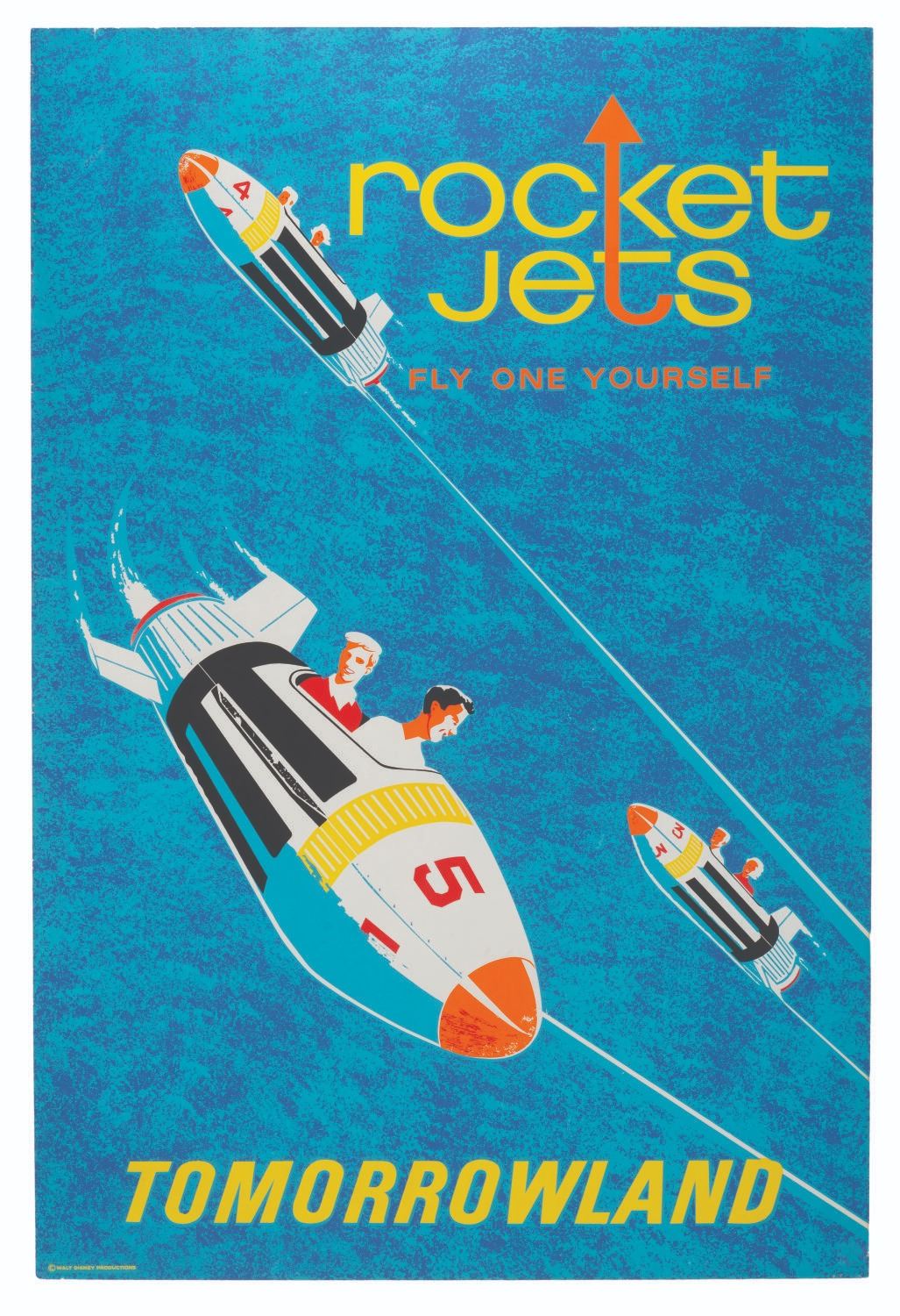 (Disneyland, 1967) An original hand-silkscreened attraction poster for the Rocket Jets in Tomorrowland. The poster was designed by Ken Chapman and borrows heavily from Bjorn Aronson's "Astrojets" poster design, which this attraction replaced in 1967. Measuring 36" x 54", the poster is in good condition with edge tears, staple holes, edge wear, adhesives on the reverse corners, and light discoloration along the edges, which is heavier on the reverse.