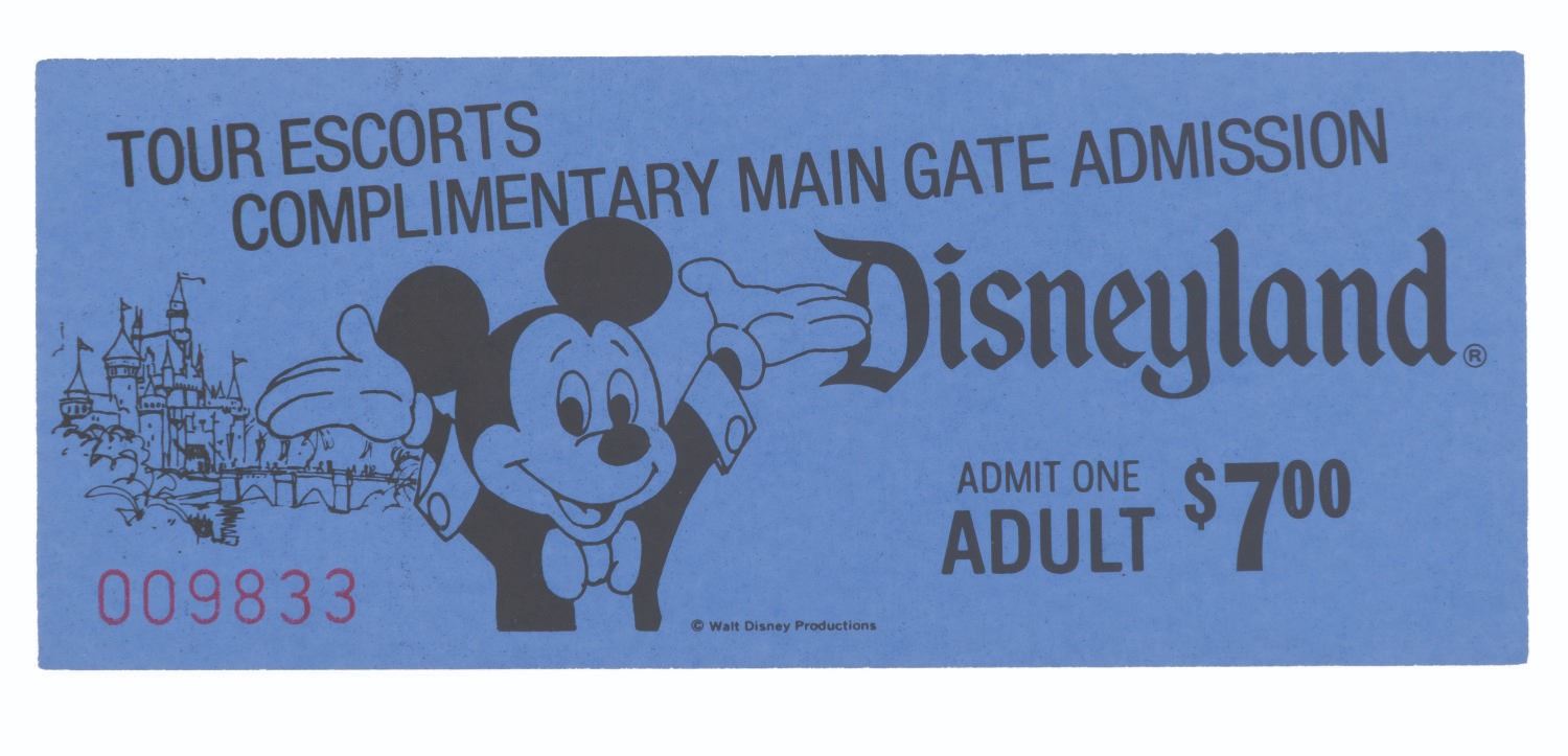 (Disneyland, 1960s-70s) A Tour Escort Complimentary Main Gate Admission Ticket, a special form of the complimentary Main Gate Admission for the guests of Disneyland Cast Members. Measuring 2.25" x 5", the ticket is numbered 009833 and in very good condition with light wear.