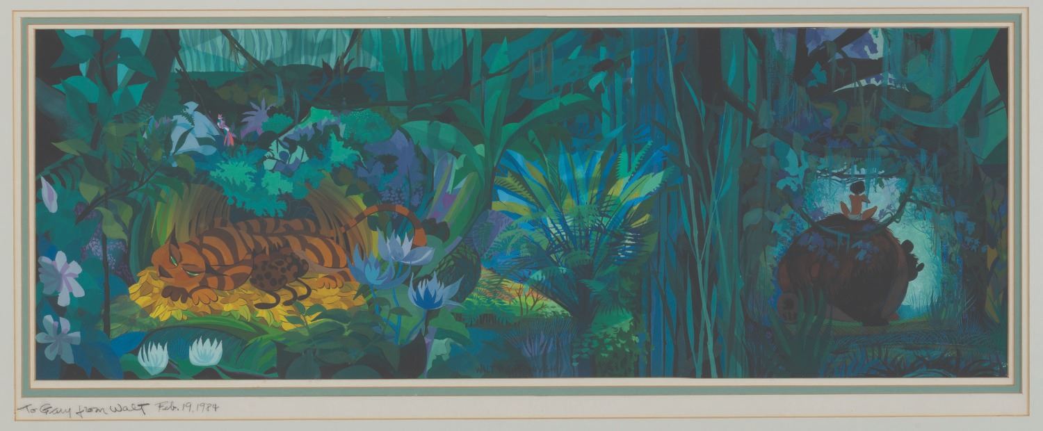 (Disney, 1964) An original color study by Disney Legend Walt Peregoy for"The Jungle Book." Story man Bill Peet left Disney in January 1964, after clashing with Walt Disney over the tone of the film. Walt instructed writer Larry Clemmons and his team to bring a more family-friendly tone to the film. Peregoy's artwork, giving warm green hues to the jungle, set a brighter tone that aligned more closely with Walt's vision and the final version. Walt Peregoy signed and dated the piece"64". The art has an image size of 11.5" x 31.5" in a 20.5" x 41" glassless frame and features a 1984 dedication to a fan on the matte. The mixed-media art is in very good condition with spots of paint loss, while the frame is in good condition with tape residue, scratches, scuffs, and wear.