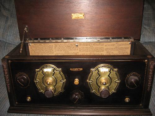 This is a really nice example of the unique 2-dial sets of 1926. The fancy brass enclosed vernier dials on a polished Bakelite panel with gold engraving makes this set a personal favorite. The chassis is also in excellent condition. Sold without tubes