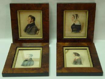 (Vermont), circa 1820's, "Untitled", (four members of one family, each a portrait in watercolours, facing left), images 4 7/8" x 3 ¾", artist and subjects unascribed, newly reframed.