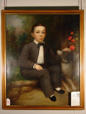 , 19th C., "Untitled", (boy with his dog), oil on canvas, 39 ½"x32 ½", signed lower left "John St___?", dated 1867, framed, (from Maryland-Delaware area).