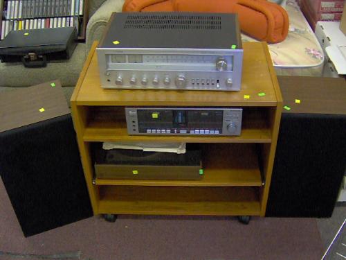 AMP, TAPE DECK, RECORD PLAYER AND 2 SPEAKERS