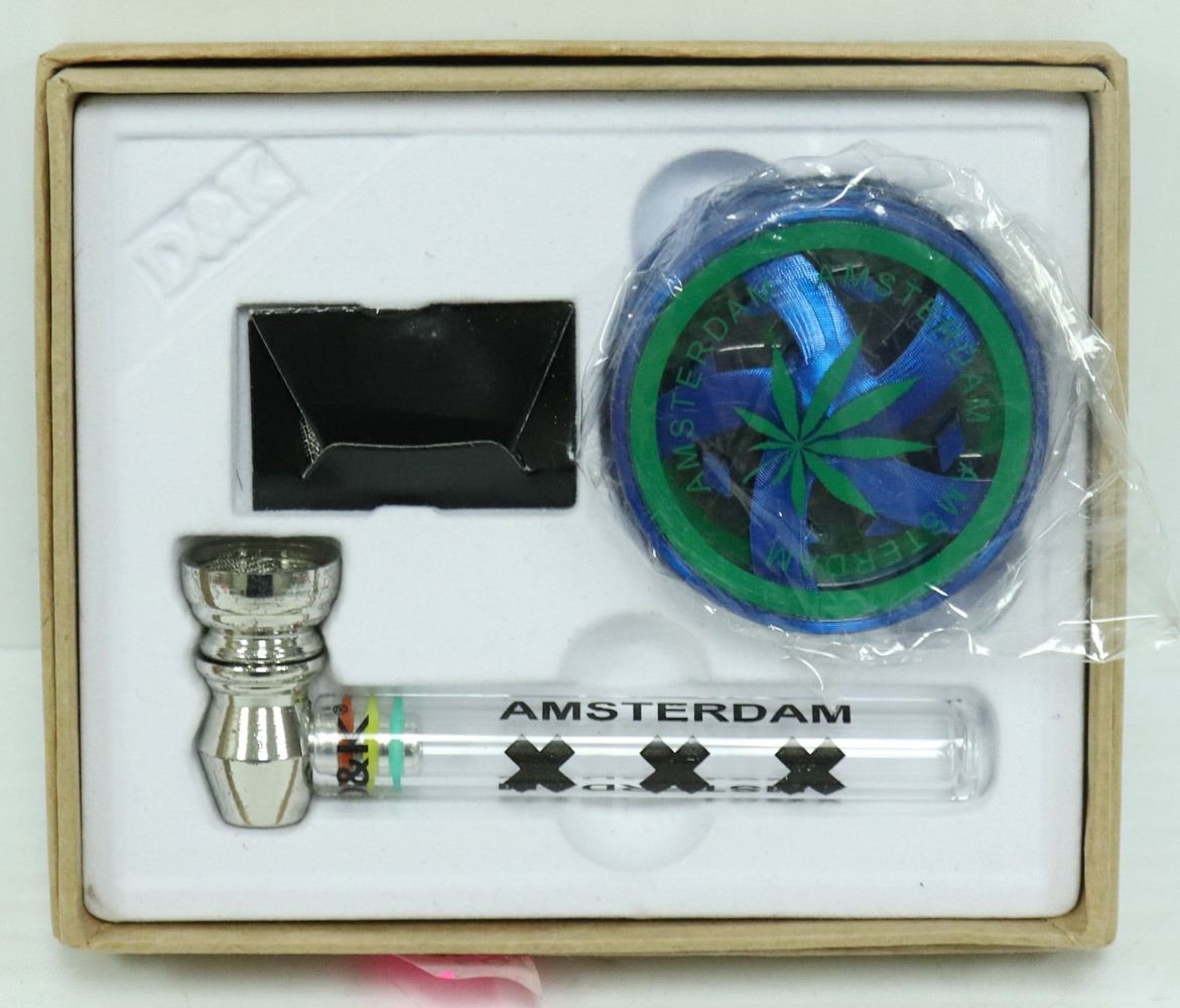 AMSTERDAM METAL/ GLASS PIPE & GRINDER SET; GREEN/