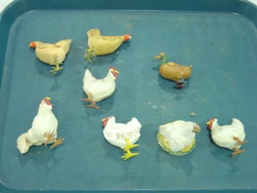 LOT OF 8 ANIMAL FIGURINES 1-DUCK 7-CHICKENS, WOOD & CLAY