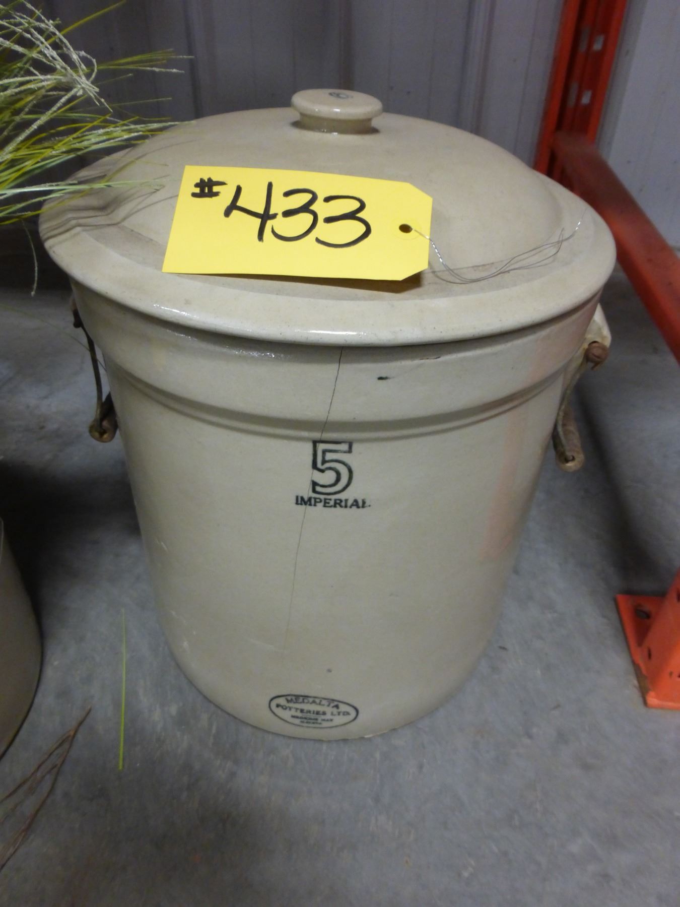 ANTIQUE 5 GALLON IMPERIAL CROCK, LID & HANDLES