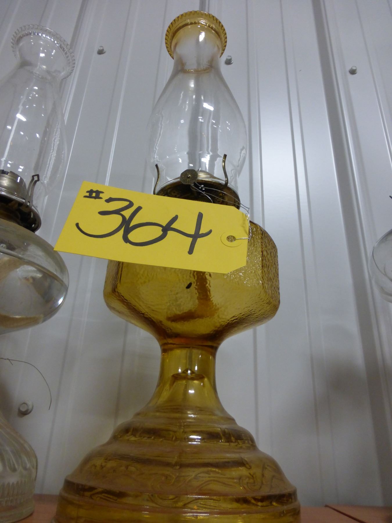 ANTIQUE AMBER BASE OIL LAMP C/W CHIMNEY