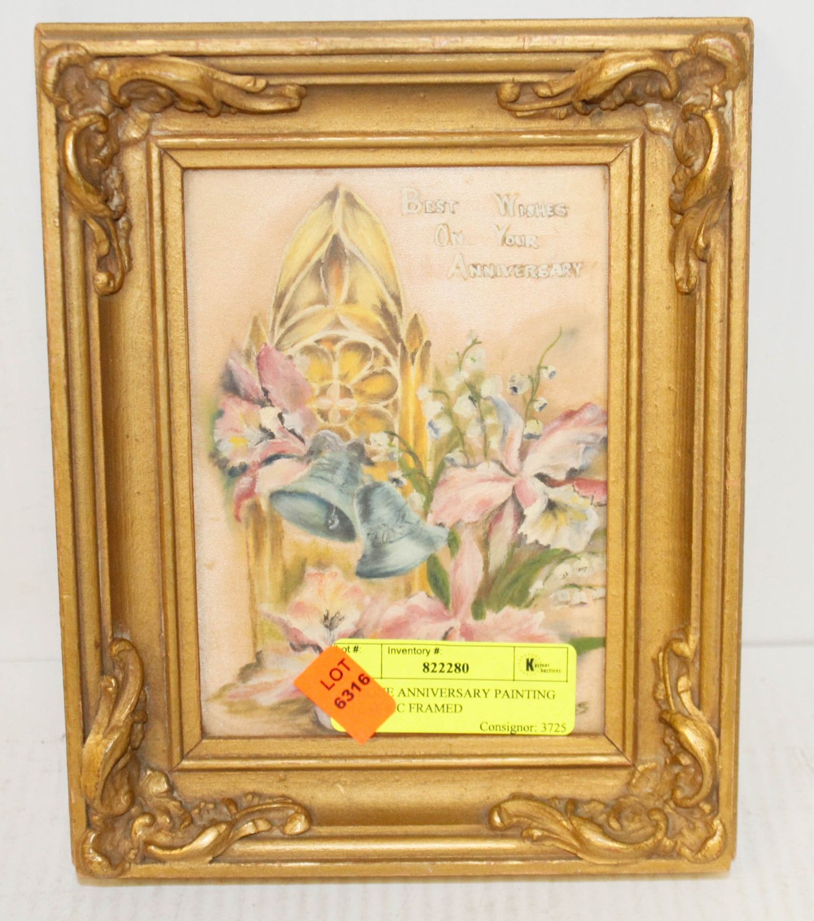 ANTIQUE ANNIVERSARY PAINTING ON FABRIC FRAMED