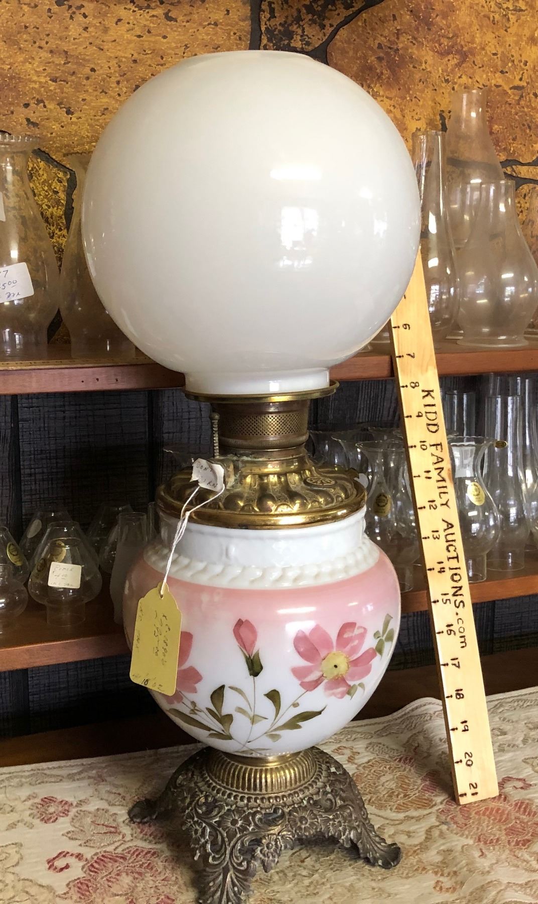 ANTIQUE BRASS & PAINTED GLASS BANQUET LAMP
