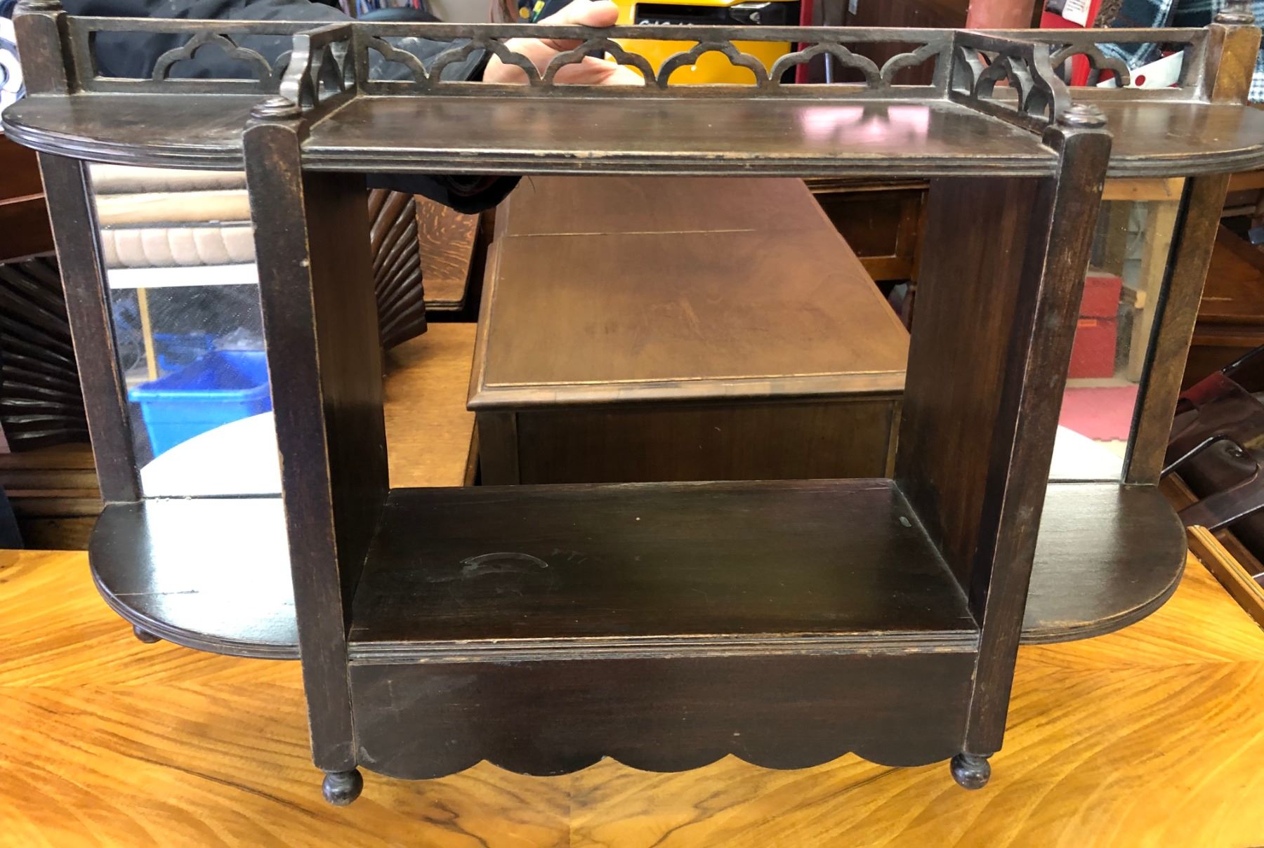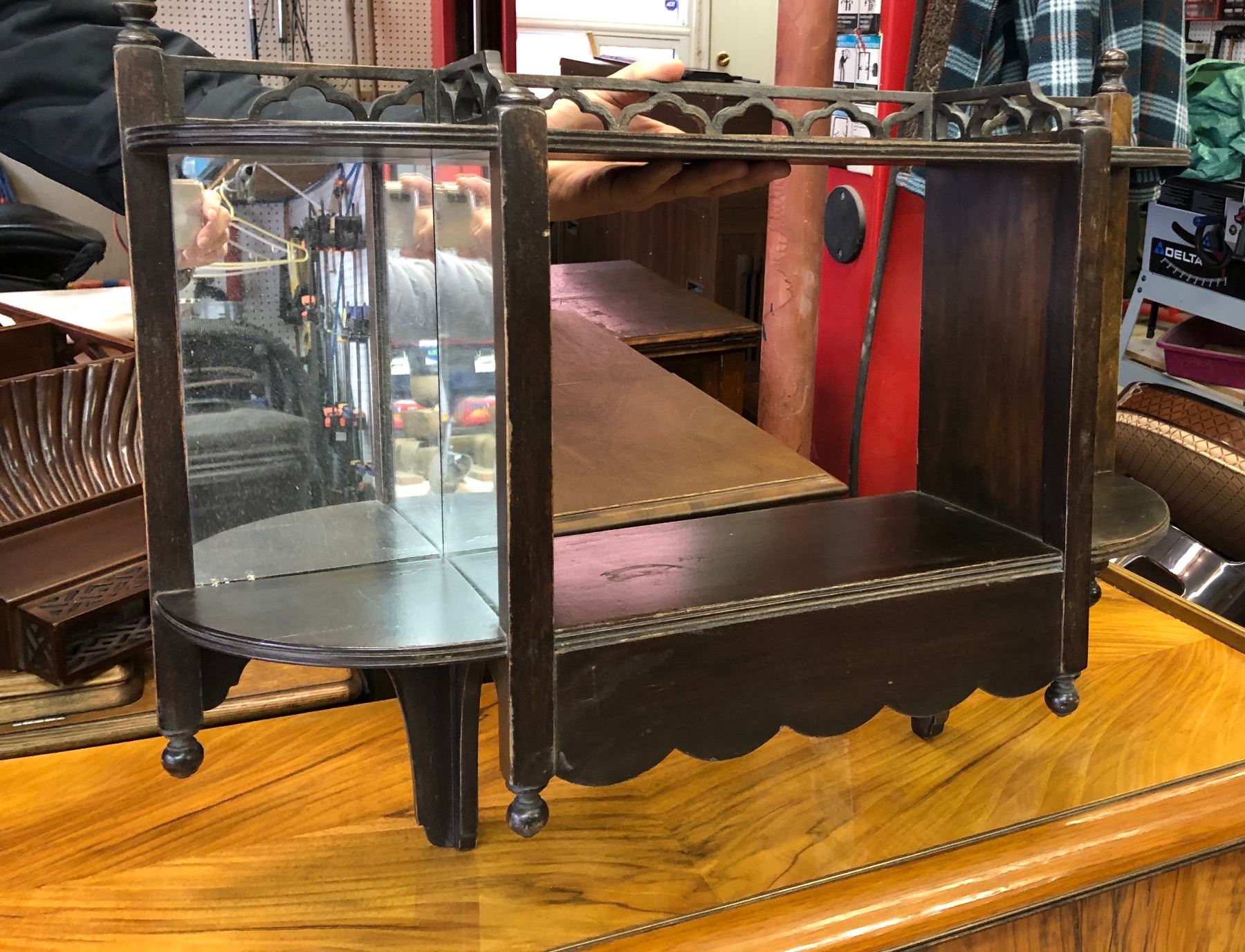 ANTIQUE NICK-KNACK SHELF WITH MIRRORED CORNERS