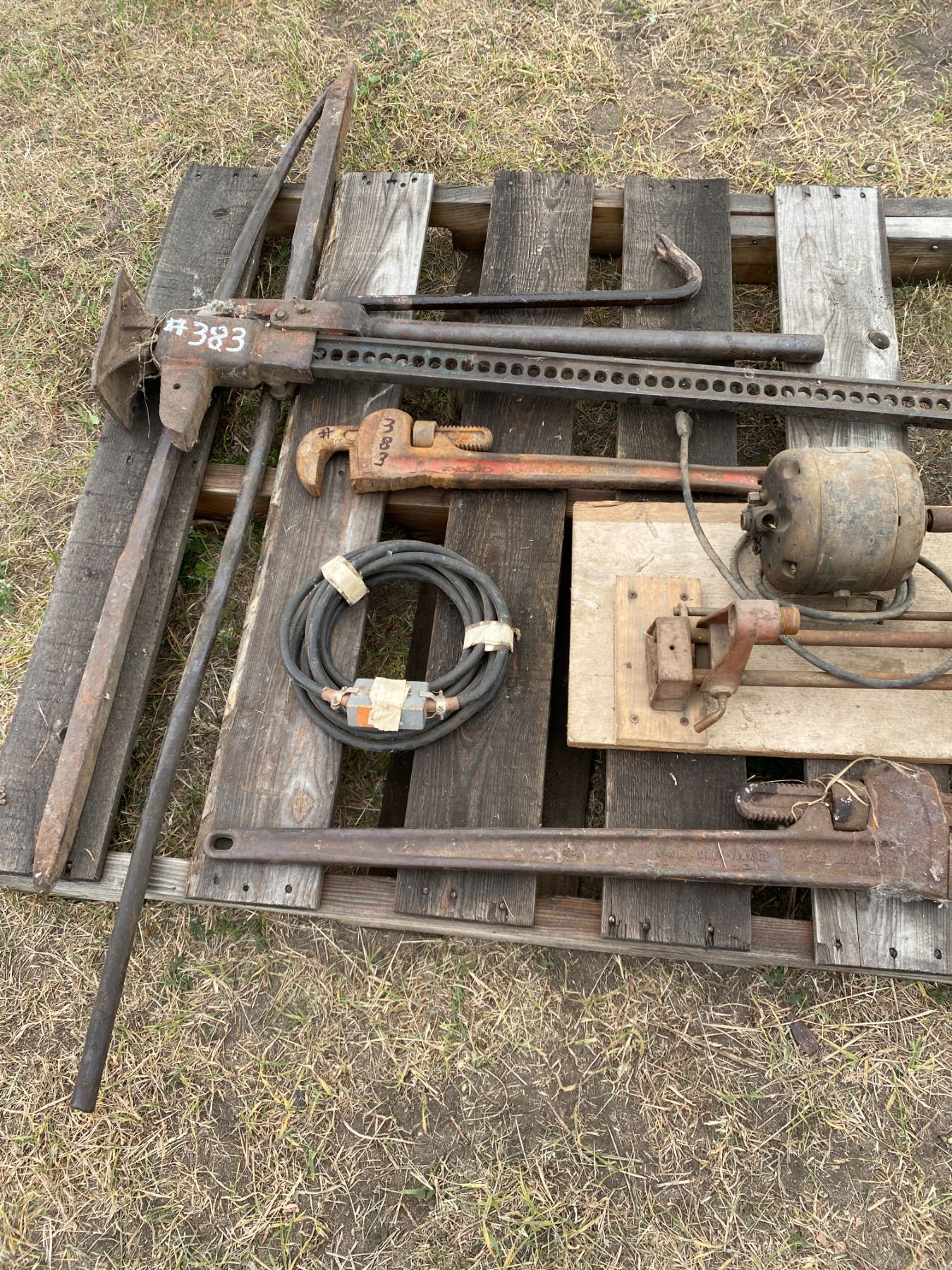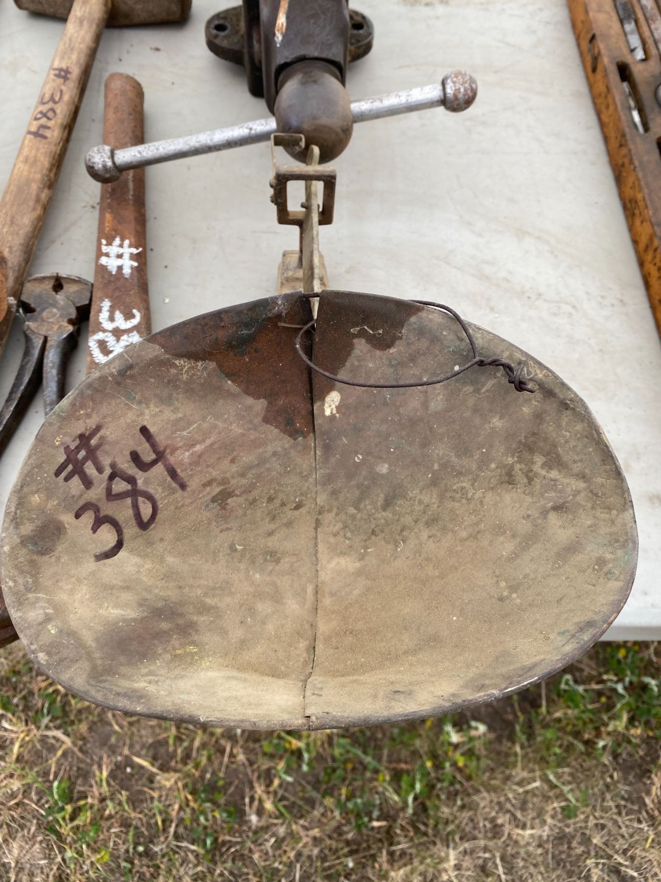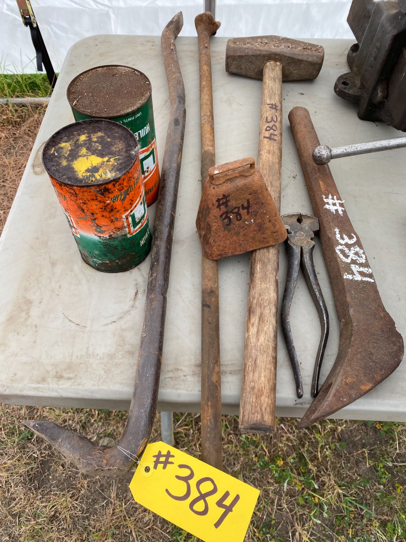 AP 2 Oil cans, cow bell, Fencing tool, sledge, old vice, 2 bars, Big Puller Jaw, old Fairbanks scale