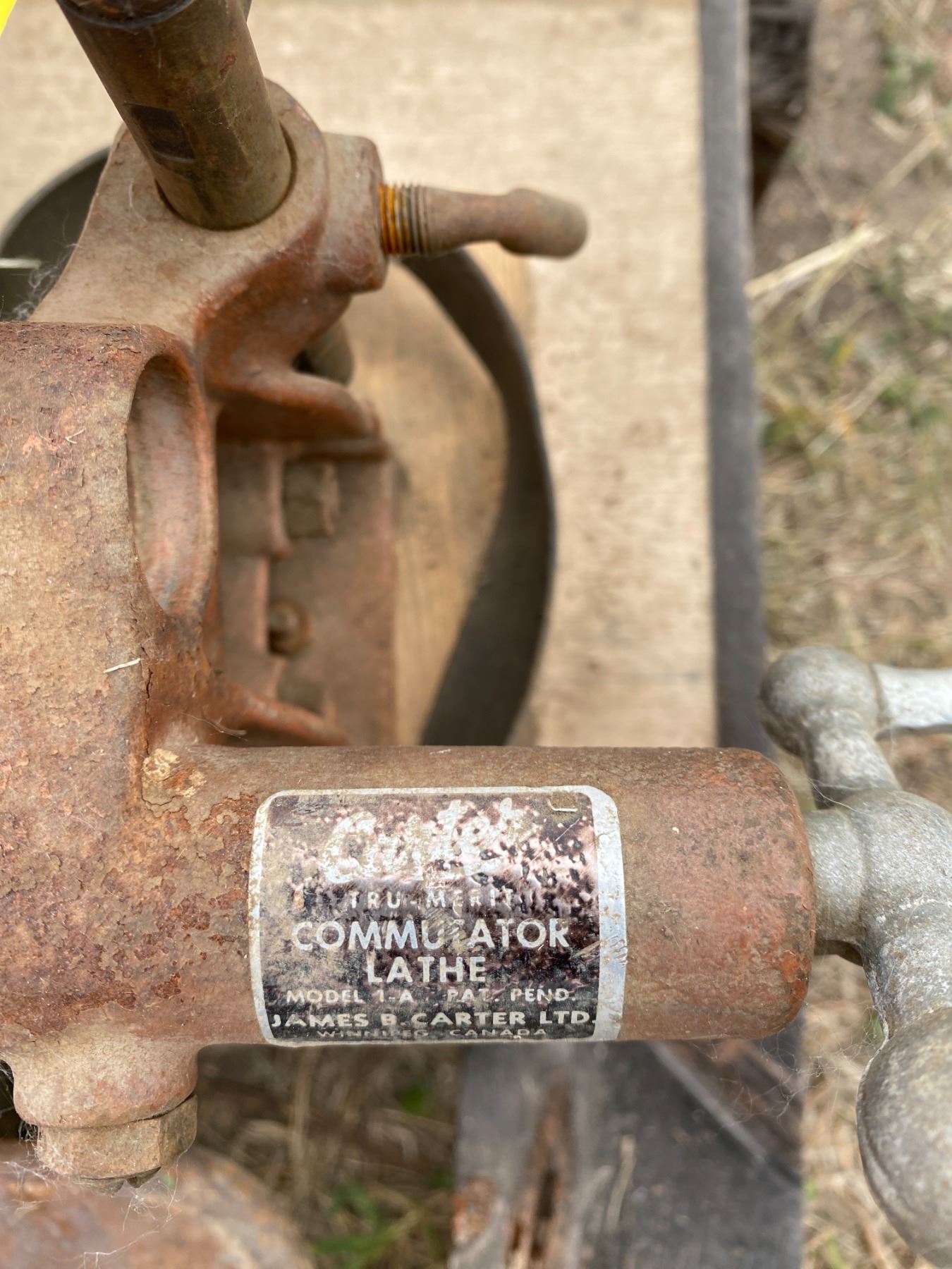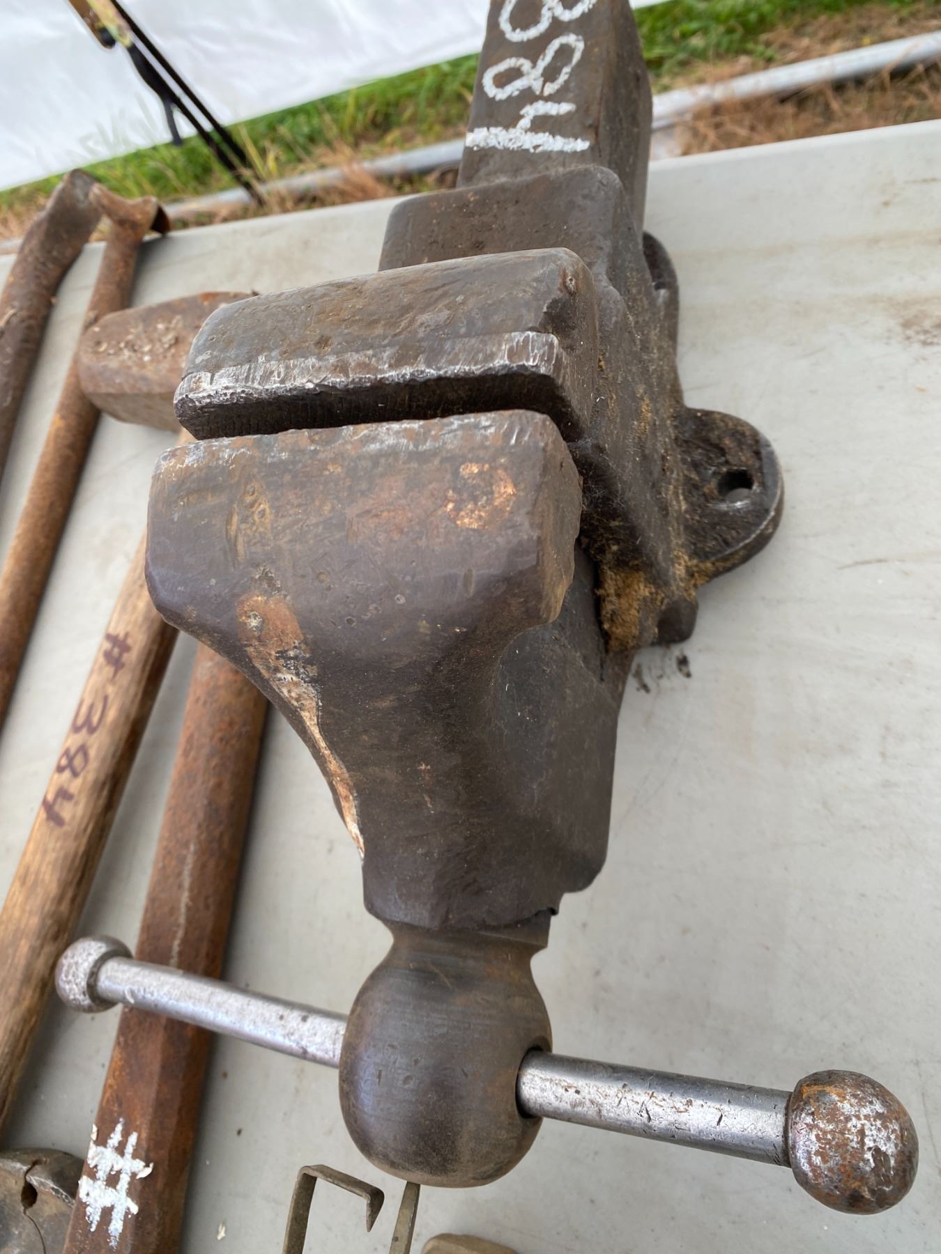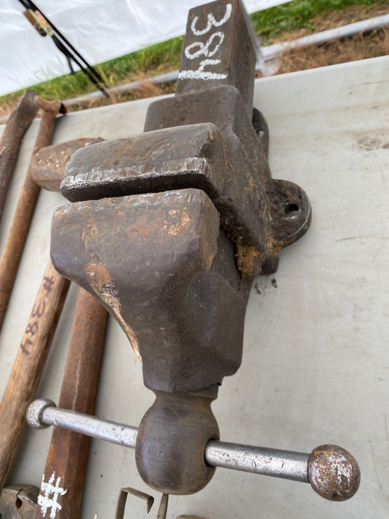 AP 2 Oil cans, cow bell, Fencing tool, sledge, old vice, 2 bars, Big Puller Jaw, old Fairbanks scale
